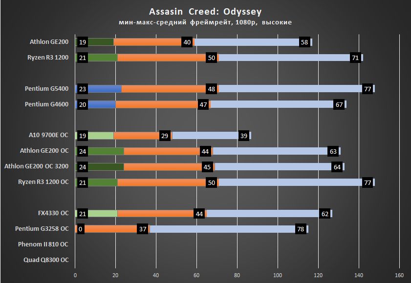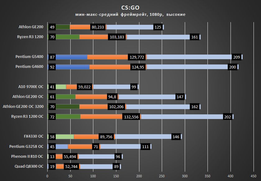Аутсайдеры не изменились: старые камни и двухпоточный G3258 не справляются с игрой. Немногим лучше она дается и A10 9700. 200GE неплохо справляется с нагрузкой, но даже в разгоне немного не дотягивает до стокового R3 1200. Разгон младшего Ryzen, в свою очередь, позволяет поднять минимальный и средний FPS, гарантируя более стабильный геймплей, чем младшие современные процессоры Intel.