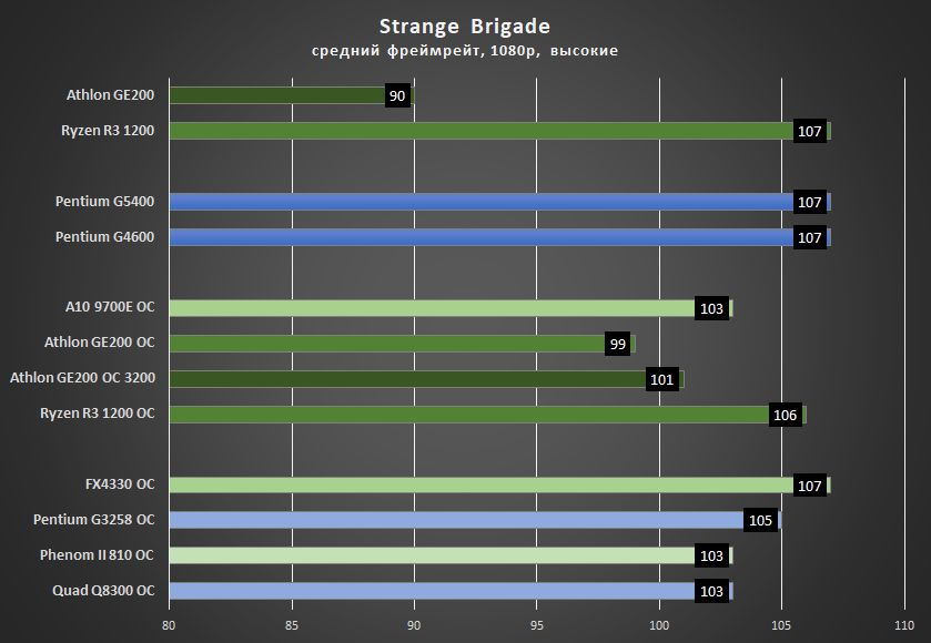 Такое ощущение, что игра не использует больше двух потоков, и мы уперлись в видеокарту: разгон R3 1200 не дает прироста, как совпадают и результаты обоих пентиумов LGA1151(v2). Результат 200GE тоже колеблется на одном уровне, обеспечивая чуть худшее быстродействие. По традиции: A10 9700E еле переваривает игру, а старички совсем не справляются.