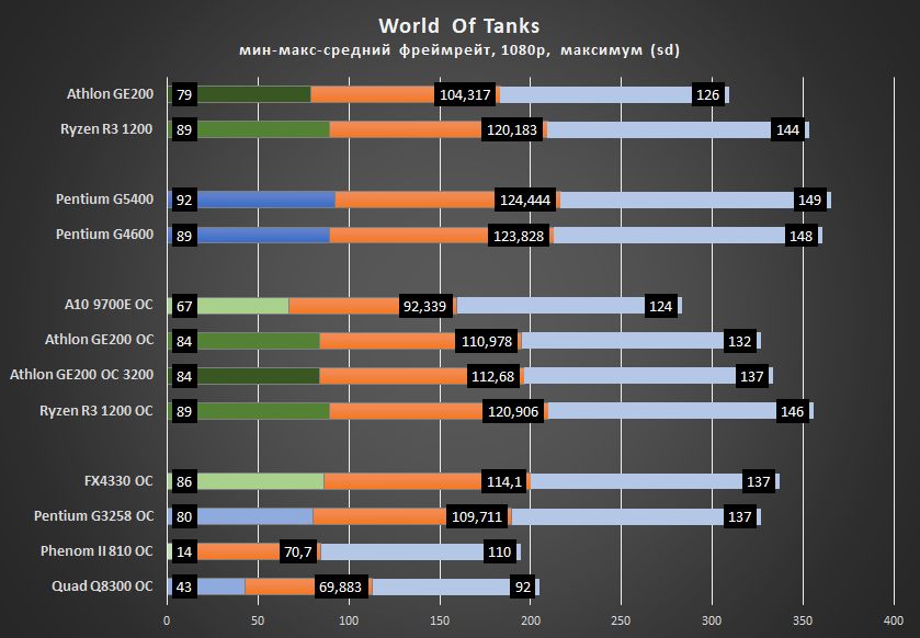 Танки недавно оптимизировали под многопоточность (привет, вылеты клиента!), но и Pentium G3258 хватает для нужд игры. Очень сильно просадили видеокарту только старые процессоры 2009 года, старшие процессоры теста уперлись в настройки графики.