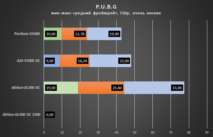 Даже на минимальных настройках в полноценный клиент пубг не поиграть. Лучше всех выступил Athlon 200GE, возможно, если поднять частоту графического ядра и памяти — можно было бы зацепиться за минимальные 24 и средние 30к\с. Старый A10 APU от AMD и конкурент от Intel показывают откровенное слайдшоу.