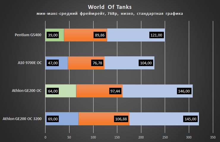Встройка Pentium хорошо справляется с игрой на минимальных, примерно так же ведет себя и A10. Athlon 200GE показывает лучшие результаты, совместимые с надеждой чуть поднять графоний.