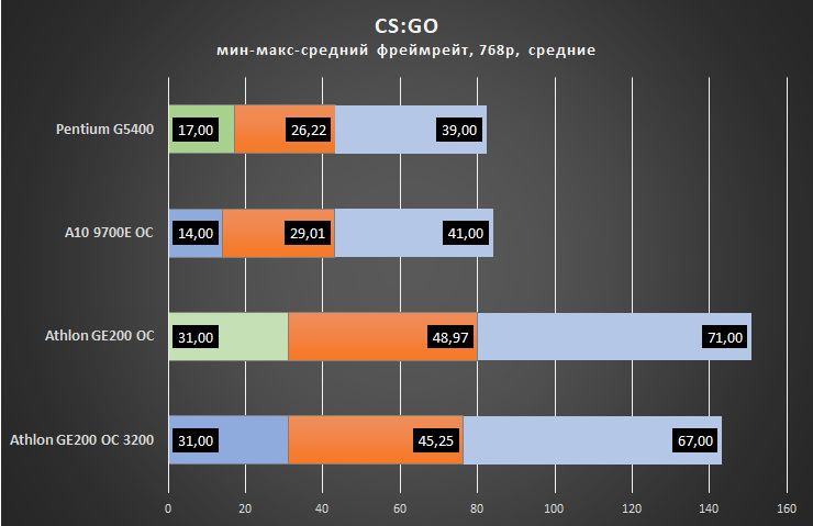 Несмотря на то, что для внешней графики 200GE оказался заметно слабее, его встроенная видеокарта — единственная показывает играбельный фпс на средних настройках.
