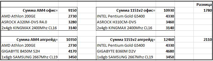 Стоимость минимальной и перспективной сборки под апгрейд (м.2 слот, разгон для AM4 платформы). Для использования встроенной графики предпочтителен двухканальный режим памяти (+20-30% производительности). Цены в одном магазине на 29.04.2019. Разница стоимости устойчиво в пользу системы на Athlon GE200.