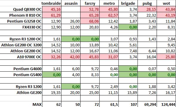 Зеленый – лидер. Белый – до 25% отставания, красный – более четверти потерь. Здесь лидерство делят разогнанный Ryzen и Pentium G5400. Athlon 200GE неплохо справляется с загрузкой не самой плохой видеокарты, RX480, срезая с нее 7-25% в номинале и 5-15% в разгоне, что уже можно считать отличным результатом.