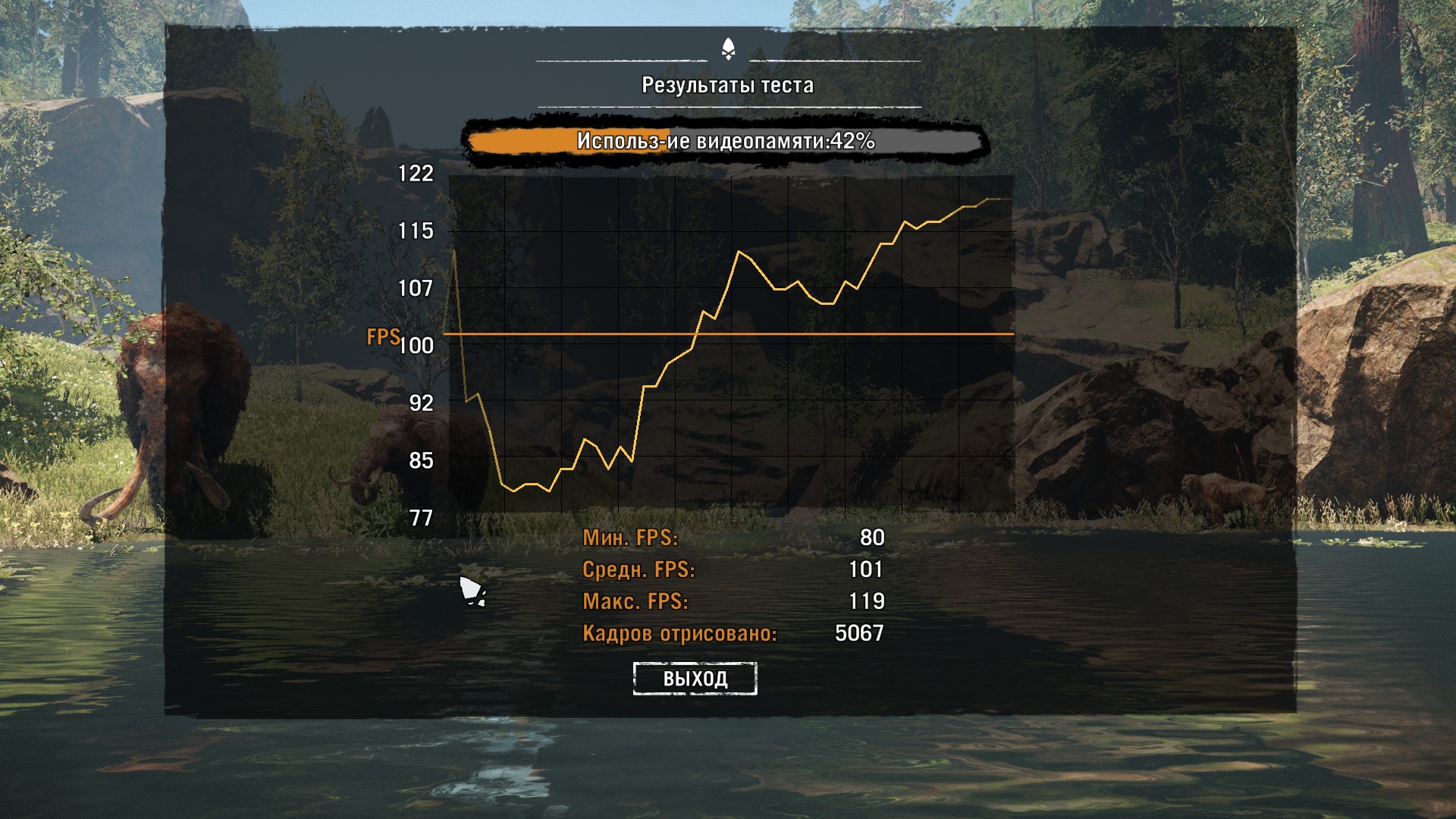 Far Cry Primal также имеет встроенный бенчмарк. Результат на максимальных настройках вышел таким: