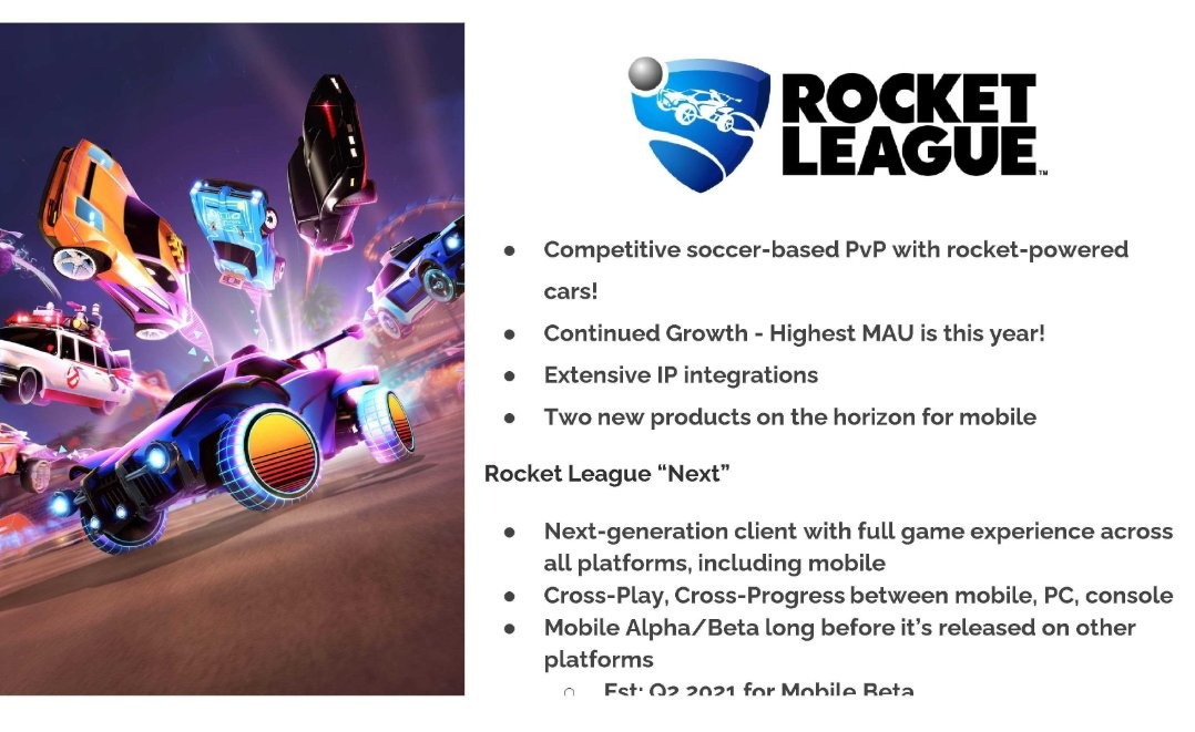 Стоит обратить внимание на пункты списка, выделенные на слайде. Rocket League обладает огромным потенциалом для интеграции IP, потенциально позволяя получать существенный доход за счет покупок в приложениях. Но, учитывая борьбу, которая в настоящее время ведется между Epic Games и Apple, планы, скорее всего, отложены до завершения судебного разбирательства. В настоящее время Fortnite нет даже в iOS App Store.