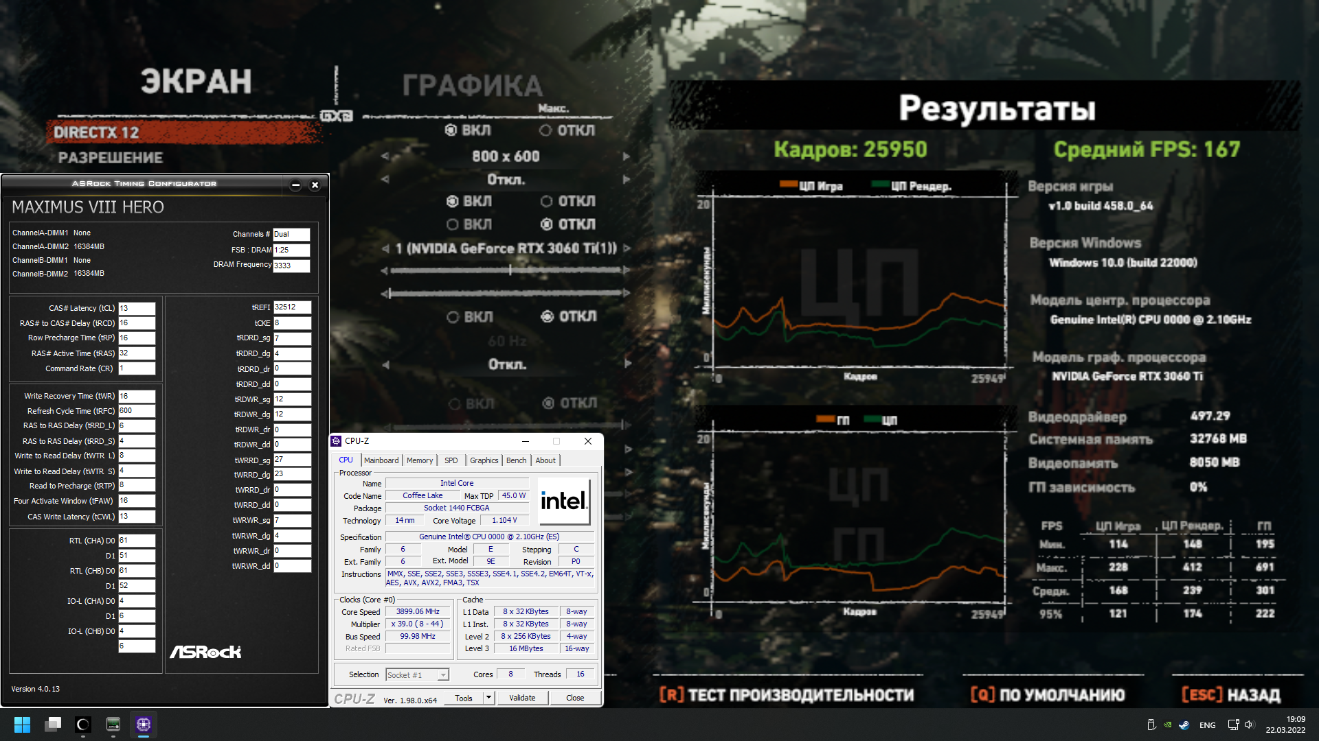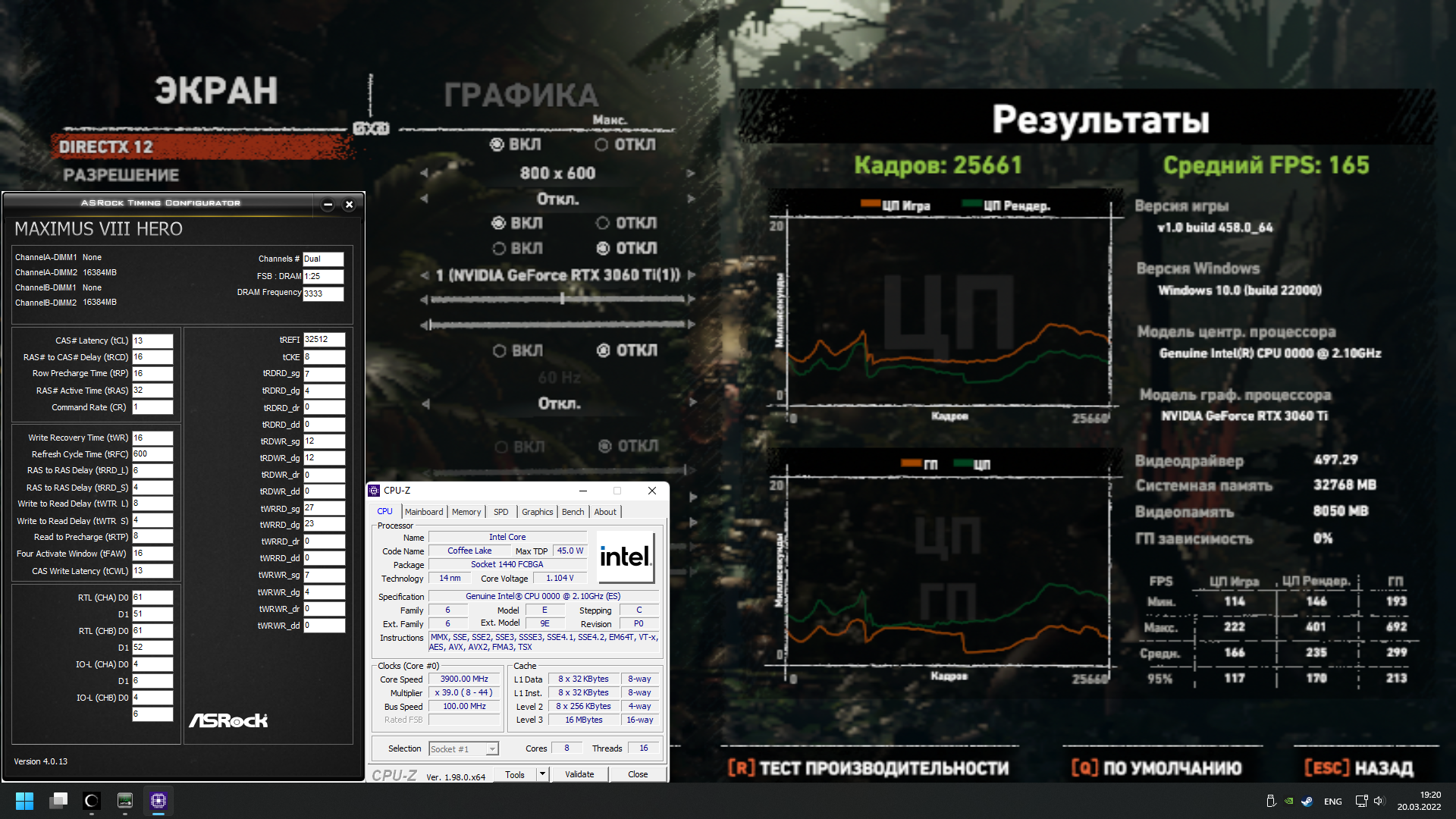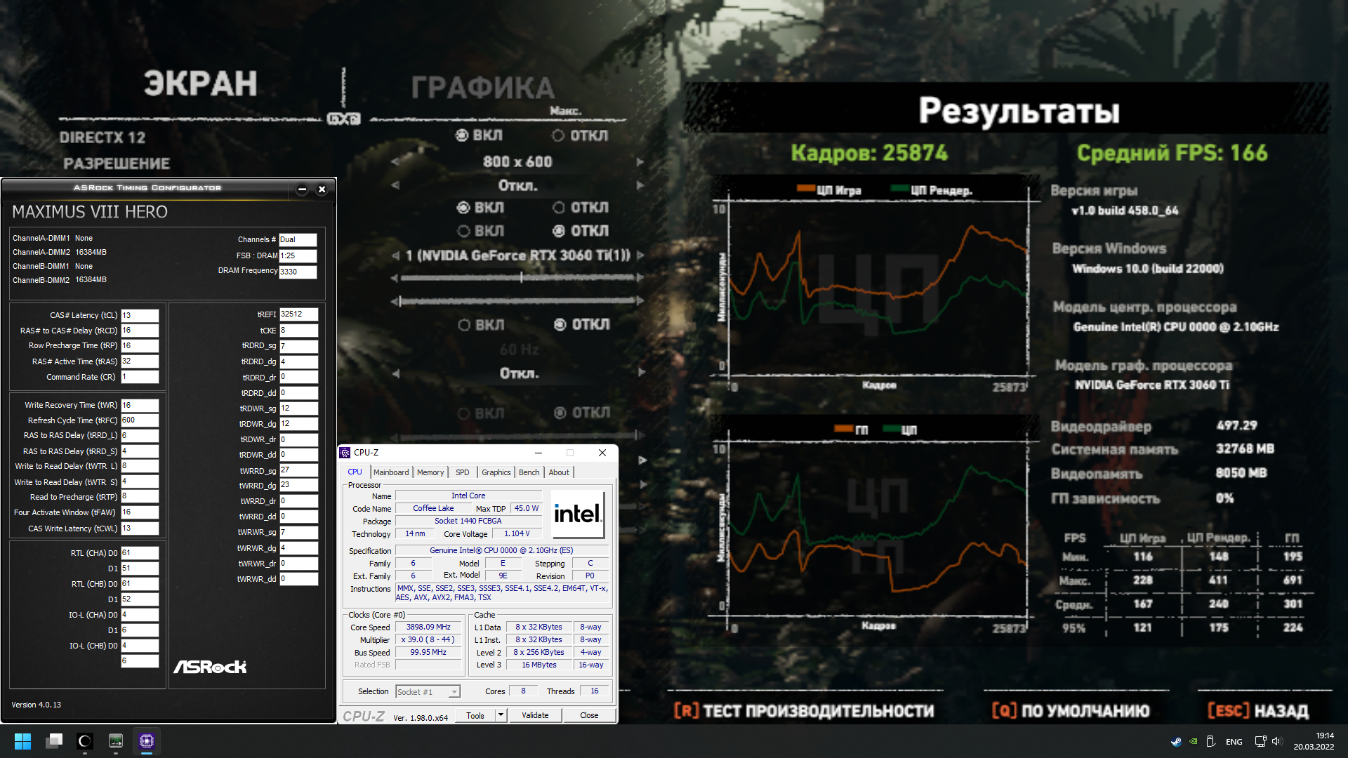Для каждого случая проводится по два прогона в бенчмарке и в игре. Каждый прогон – после перезагрузки. Подсчитываются средние значения и погрешности.