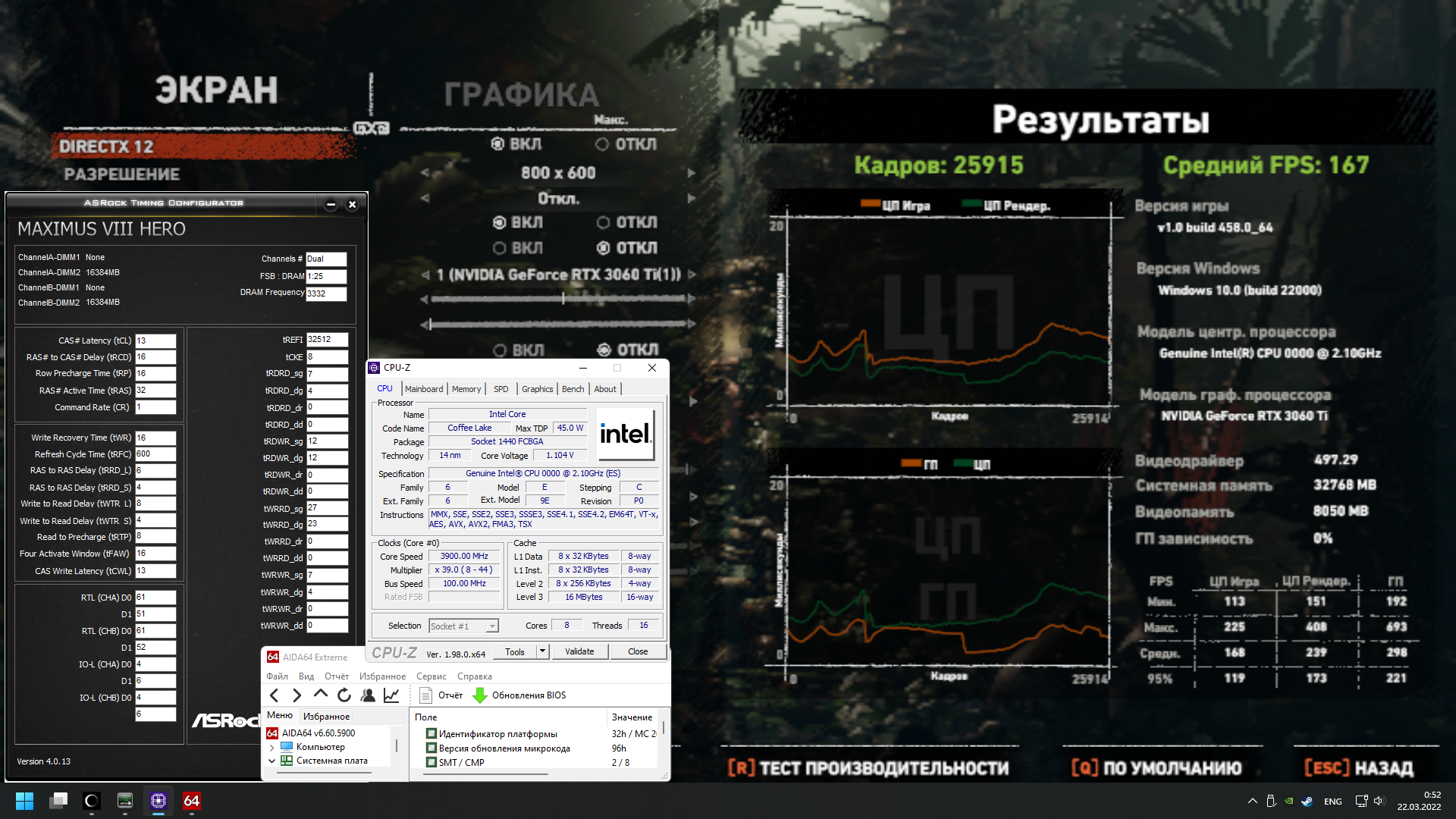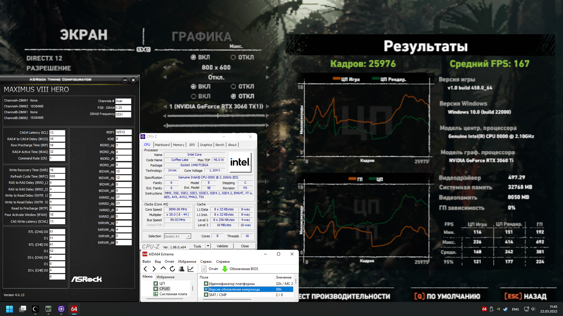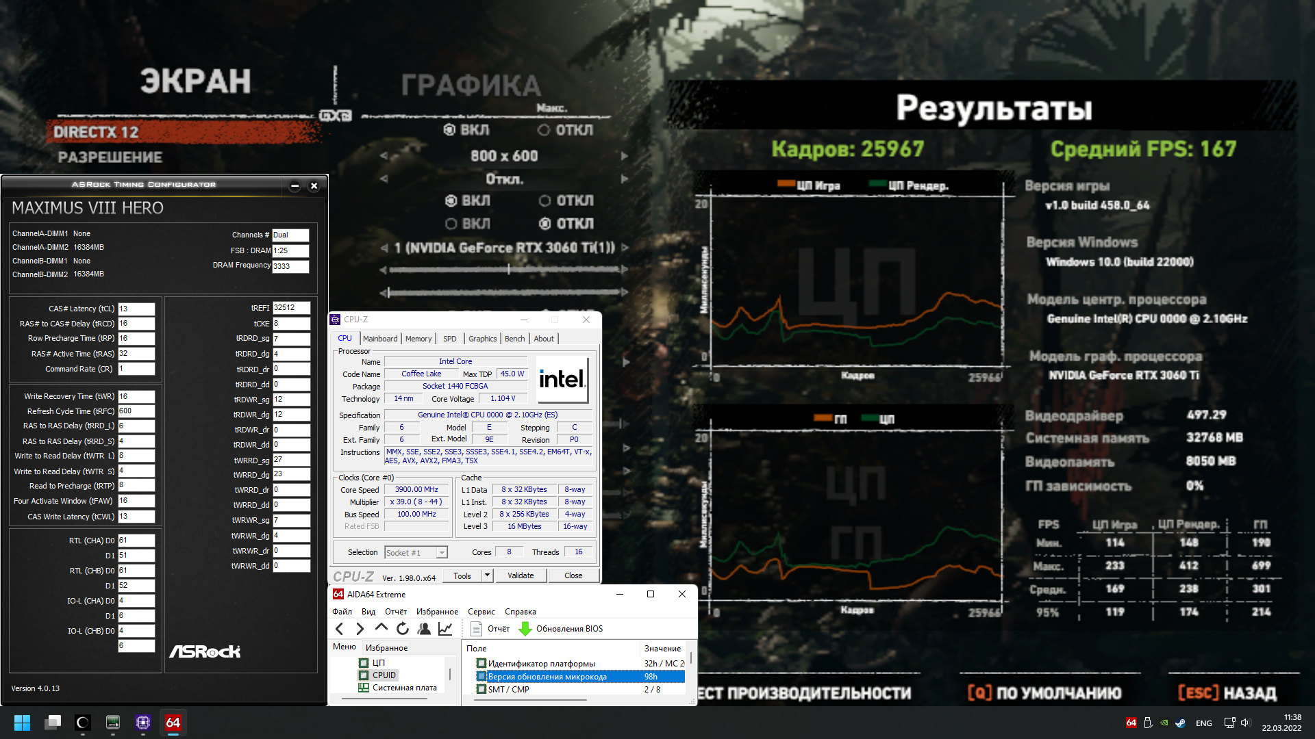 Для каждого случая проводится по два прогона в бенчмарке и в игре. Каждый прогон – после перезагрузки. Подсчитываются средние значения и погрешности.