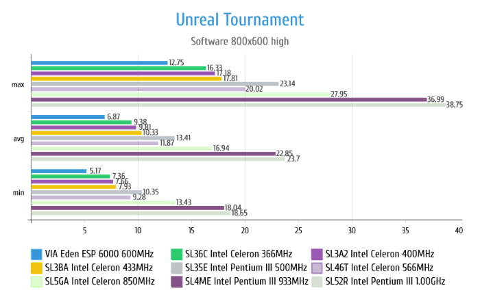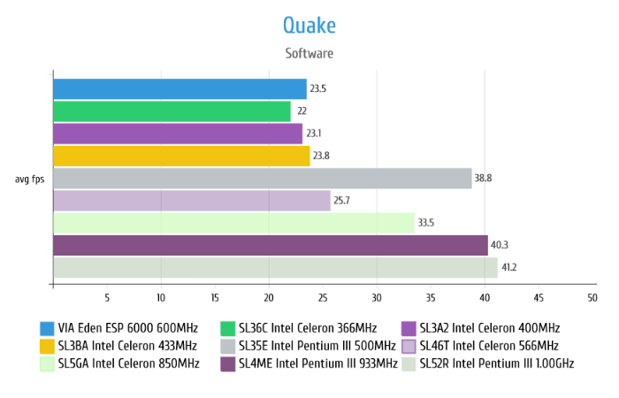 В Quake II опять же делает упор на размер кэша что видно на примере провала VIA Eden у которого его всего 64Kb, а также любит широкую шину у процессора.