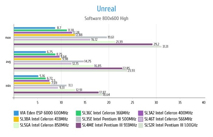 С синтетикой я допустил небольшую ошибку, а именно не учёл оптимизацию под SSE, как видим процессоры разделились чётко на 2 лагеря с SSE и без такового. В принципе ничего страшного и уровень производительности в целом можно понять, однако при отключении SSE показания достаточно существенно падают, например, SL52R Intel Pentium III 1.00GHz показывает уже не 14367, всего 8596 попугаев. Впрочем, это всё равно более чем в 2 раза больше чем показывает SL3BA Intel Celeron 433MHz.