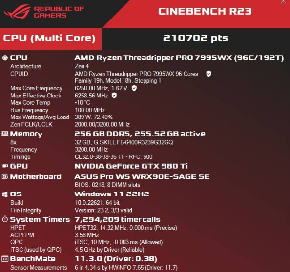 Разогнанный Ryzen Threadripper PRO 7995WX в Cinebench R23 получил 210000 баллов