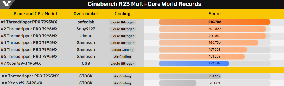 На прошлой неделе процессоры AMD установили несколько мировых рекордов с различными способами охлаждения, включая воздушное и жидкостное. Процессор AMD набрал более 200 тысяч баллов в Cinebench R23, превзойдя все предыдущие процессоры в официальном рейтинге HWBOT. Примечательно, что нынешний мировой рекордсмен Safedisk набрал впечатляющие 210 702 балла, соответствующие разгону на 78% по сравнению со стандартными показателями с воздушным охлаждением.