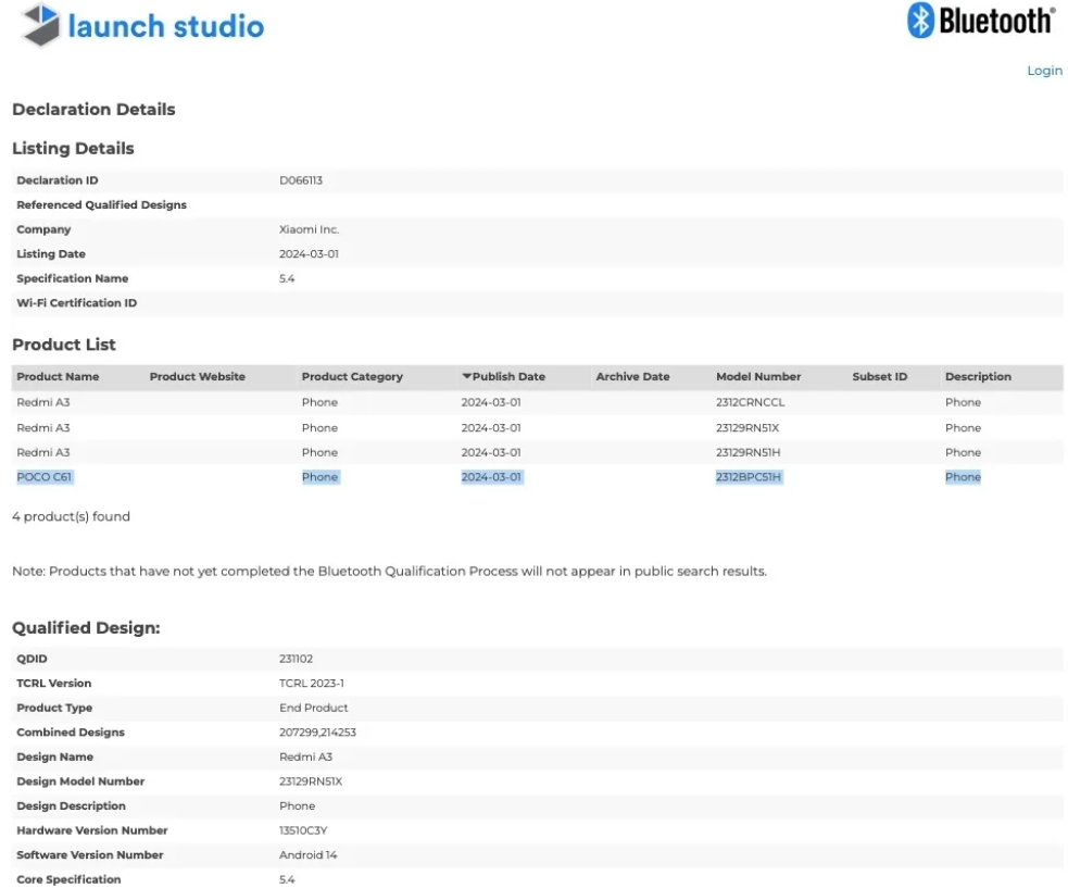 Соответственно, POCO C61 почти наверняка теперь также известен под номером 2312BPC51H, который, как признает сама BIS, слишком похож на номер модели 23129RN51H, принадлежащий Redmi A3. В связи с этим Bluetooth SIG полностью выдает устройство, подтверждая, что два смартфона являются одним и тем же, и имеют общий сертификат на сайте.