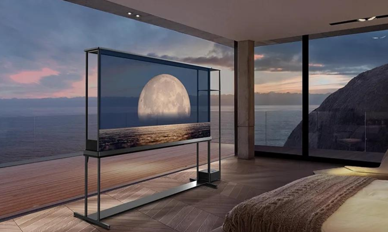 Прозрачный режим также удобен при использовании телевизора в качестве аудиоплеера и позволяет телевизору легко вписаться в пространство помещения, когда он не используется. Когда пользователь хочет посмотреть фильм или телешоу, то нужно просто поднять шторку одним нажатием кнопки.