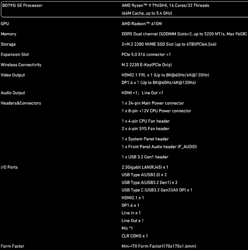 Компания Minisforum представила две новые материнские платы, которые будут использоваться в её мини-ПК: BD795M (M-ATX) и BD795i SE (Mini-ITX), расширив свой ассортимент уже имеющихся плат. Стоит отметить, что новые материнские платы очень похожи на модели серии BD790i, и используют всё тот же распаянный на них 16-ядерный процессор AMD Ryzen 9 7945HX, работающий на частоте до 5,4 ГГц и включающий встроенную графику начального уровня AMD Radeon 610M. Однако новые платы всё-таки немного отличаются друг от друга. Что касается технических характеристик, то они включают два слота M.2 2280 SSD, один из которых имеет интерфейс PCIe 5.0, поддержку оперативной памяти DDR5 SODIMM со скоростью работы до 5200 МТ/с и максимальную емкость до 96 ГБ. Материнские платы могут похвастаться полноценным разъемом PCIe 5.0 x16 для пользователей, желающих установить в систему дискретную видеокарту.