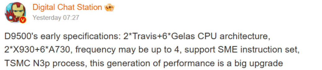 Согласно подробностям, предоставленным инсайдером Digital Chat Station, чипсет Dimensity 9500 имеет конфигурацию процессорных ядер 2+6, заменяющую архитектуру с полностью производительными ядрами своих предшественников. Чипсет включает в себя два ядра Cortex-X930 Travis и шесть ядер Cortex-A730 Gelas. Этот дизайн похож на Qualcomm Snapdragon 8 Elite, уделяя особое внимание балансу между производительностью и эффективностью.