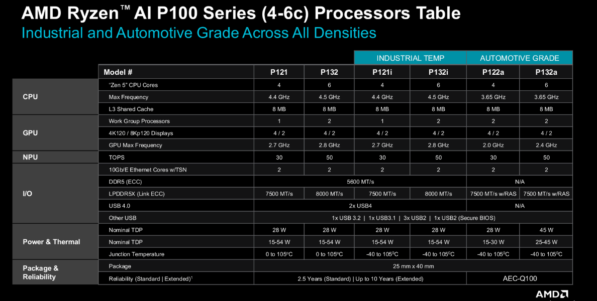 Опубликованная AMD линейка P100 начинается с 4-х и 6-ядерных моделей для коммерческого, промышленного и автомобильного сегментов, включая P121, P132, P121i, P132i, P122a и P132a. Производительность NPU составляет от 30 до 50 TOPS в зависимости от модели. Что касается портов ввода-вывода, AMD указывает поддержку двух портов 10GbE с TSN, а также USB4 для моделей, не предназначенных для автомобильной промышленности. Поддержка памяти включает LPDDR5X с ECC на скорости до 8000 МТ/с на отдельных моделях.