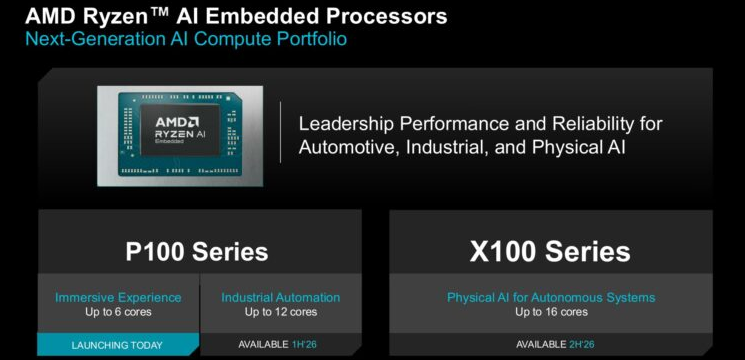 Компания AMD представила линейку встраиваемых x86 процессоров Ryzen AL Embedded для двух рыночных ниш. Серия P100 ориентирована на автомобильные системы и промышленную автоматизацию, а X100 — на более ресурсоемкие проекты в области физического ИИ и автономного проектирования.