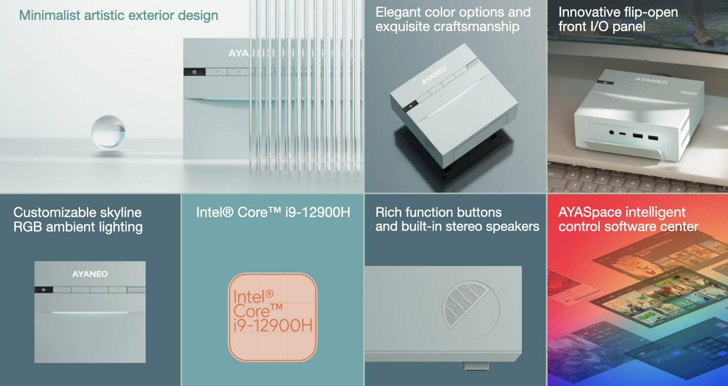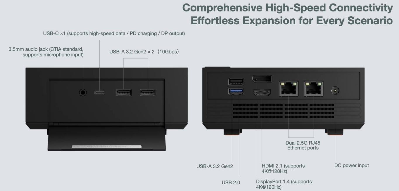 На откидной передней панели скрывается порт USB-C с поддержкой видео, зарядки и передачи данных, а также 3,5-мм аудио разъем и два порта USB 3.2 Gen 2 Type-A. На задней панели расположены два порта LAN 2,5 Гбит/с, DisplayPort 1.4, HDMI 2.1, USB 3.2 Gen 2 Type-A, USB 2.0 Type-A и вход питания. Мини-ПК также включает стереодинамики и пять кнопок, в том числе для управления подсветкой и отключением звука, а также две программируемые клавиши через AYASpace.
