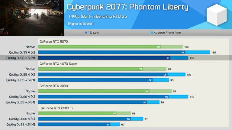 Аппаратное обеспечение у Unboxed было сфокусировано на необработанных данных в разрешении 1440p с использованием режима масштабирования качества. Была обнаружена аналогичная закономерность: DLSS 4.5 примерно на 9% медленнее, чем DLSS 4, на графических процессорах Ada среднего класса, таких как RTX 5070, и на целых 20-30% медленнее на моделях Ampere и Turing. Видеокарты RTX 40 и RTX 50 сохраняют приемлемый прирост частоты кадров по сравнению с обычным рендерингом, но в более старых сериях часто наблюдается снижение или даже отрицательное масштабирование.