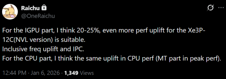 По словам инсайдера Raichu, вариант с 12 ядрами Xe3P будет на 20-25% быстрее, чем Xe3. Это даст Intel преимущество в интегрированной графике, учитывая, что графика Ryzen 500 "Medusa Point", по всей видимости, останется на архитектуре RDNA 3.5.
