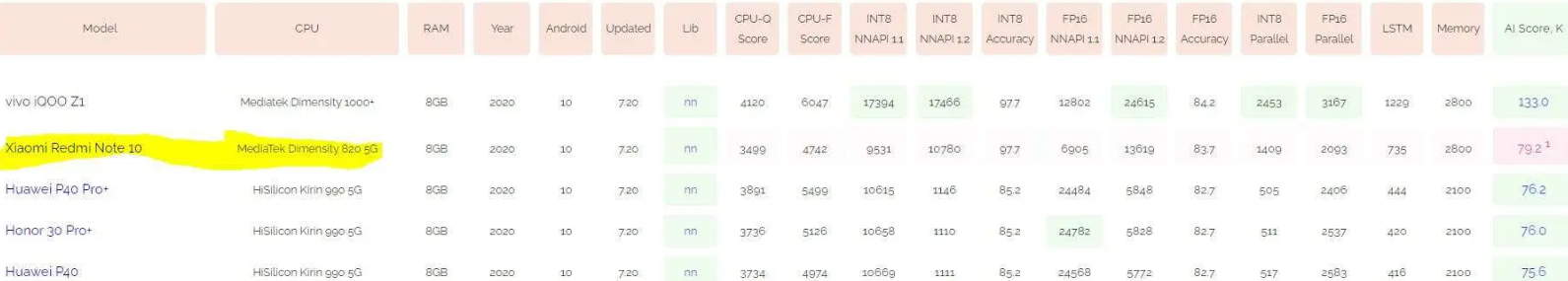 Смартфон с названием Redmi Note 10 был замечен на сайте тестов AI. Смартфон не просто появился в списке, но и занял в нем почетное второе место благодаря мобильному чипсету Dimensity 820 от компании MediaTek. На данный момент единственным устройством, которое превосходит Redmi Note 10 его, является смартфон Vivo iQOO Z1, который также оснащен процессором от компании MediaTek под названием Dimensity 1000+. Напомню, что процессоры серии Dimensity являются лучшими на сегодняшний день чипсетами от MediaTek. И судя по тестам ИИ имеют и лучшую производительность в сравнении с чипсетами других производителей. Кроме того, чипсеты серии Dimensity дают возможность подключения к сетям 5G по вполне доступным ценам.