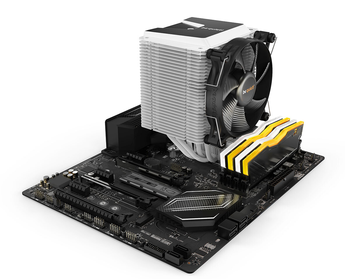 Shadow Rock 3 White оснащен пятью 6-миллиметровыми тепловыми трубкам с технологией HDT, которая использует прямое соприкосновение с теплораспределительной крышкой процессора. Это позволяет значительно ускорить теплопередачу от процессора к радиатору кулера. Что касается вентилятора, то он имеет диаметр 120 мм и по заявлениям компании be quiet ! обеспечивает уровень шума не выше 24,4 дБ даже на максимальной скорости вращения, которая составляет 1600 об/мин. Производительности данной системы охлаждения должно быть достаточно для рядового пользователя, однако, если этого будет мало, то можно самостоятельно установить дополнительный вентилятор, так как такая возможность предусмотрена конструкцией Shadow Rock 3 White.