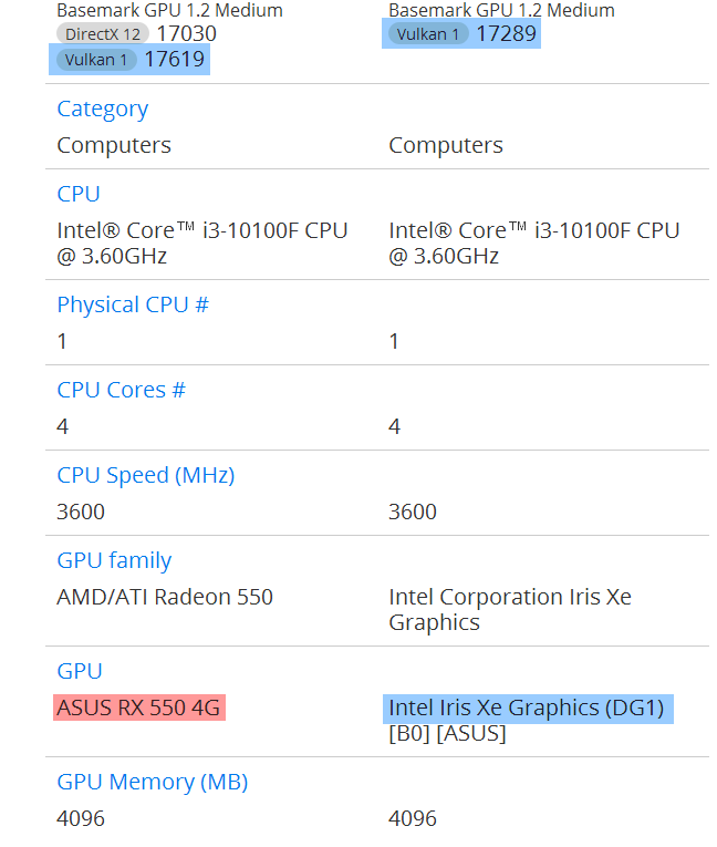 Тестирование новинки проводилось в режимах Vulkan High и Medium, результаты которых составили 1267 и 17289 баллов соответственно. Это ставит дискретную видеокарту DG1 чуть ниже давно устаревшей Radeon HD 7850, которая набирает 17349 баллов с тем же API и в той же операционной системе. TUM APISAK, обнаруживший эту запись, сравнил видеокарту с Radeon RX 550 с немного более современной архитектурой Polaris: