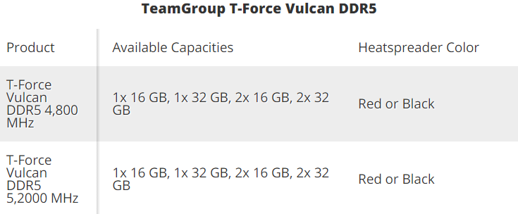 Компания TeamGroup представила комплекты памяти T-Force Vulcan стандарта DDR5. Комплекты доступны в одномодульном или двухмодульном вариантах с максимальными частотами до 5200 МГц и максимальной емкостью 64 ГБ (2x 32 ГБ). Радиатор новинки будет выпущен в двух цветах: вулканический красный или черный с одинаковой для обоих вариантов печатной платой черного цвета.