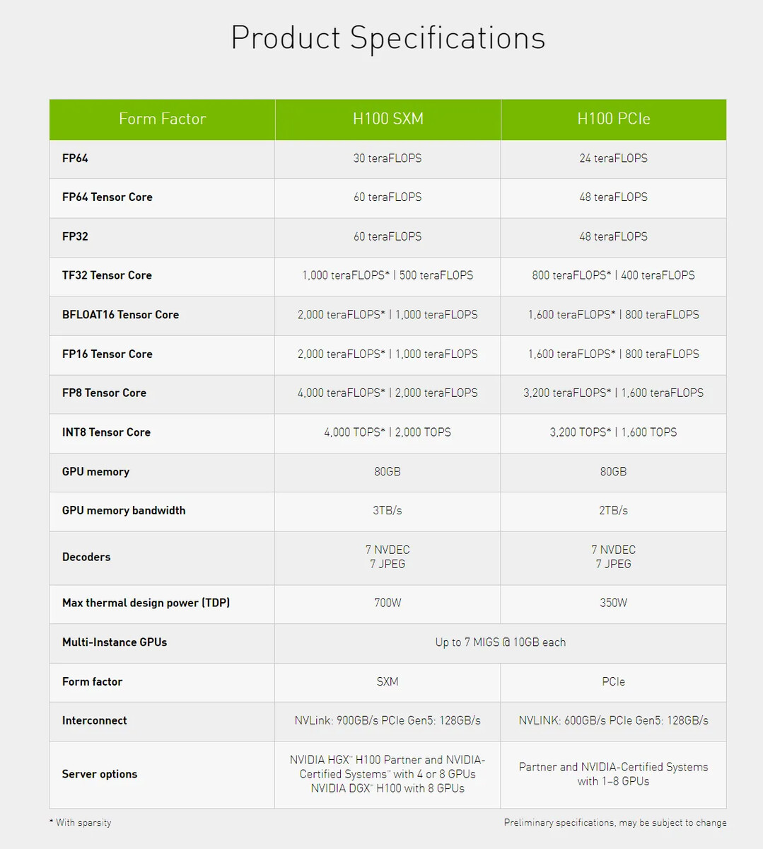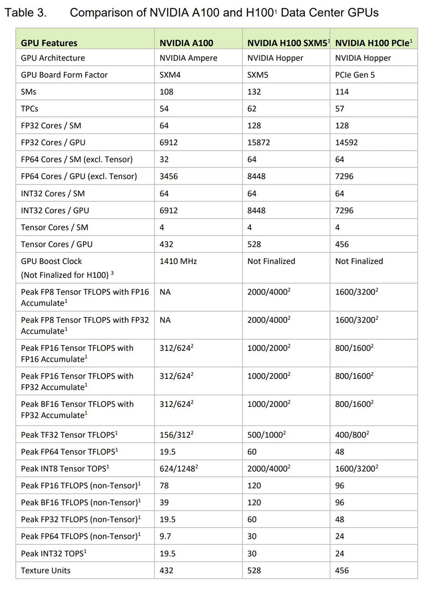 Кэш L2 также претерпел изменение и увеличился с 40 МБ до 50 МБ, но шина памяти осталась прежней 5120 битной, а объем памяти HBM3 составляет 80 ГБ с пропускной способностью 3 или 2 ТБ/с в зависимости от форм-фактора. Версия SXM имеет 528 тензорных ядер и потребляет 700 Вт, в то время как версия PCIe имеет только 456 тензорных ядер и ограничена мощностью TGP 350 Вт.