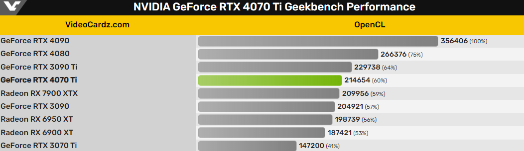 Эта оценка даже лучше, чем у только что выпущенной AMD Radeon RX 7900 XTX. Тем не менее следует иметь в виду, что OpenCL, по-видимому, отдает предпочтение графическим процессорам NVIDIA, а карты Radeon, как правило, лучше работают с Vulkan API.