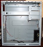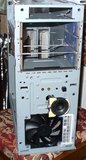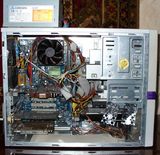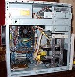 | А это система в сборе. Вентиль на задней стенке пришлось вынести за пределы корпуса, иначе боковая крышка не закроется: упирается в него ребром жесткости. Отверстие на передней стенке между двумя сидюками закрывать заглушкой не стал, вместо нее поставил сетку от пыли. Так же не стал закрывать заглушками все свободные отверстия под PCI платы, т.к. на боковой стенке никаких отверстий нет. Все "лишние" вентиляционные отвертия (благо их немного) заклеил. В результате корпус стал неплохо продуваться насквозь: через отверстие между сидюками тянет так, что если приложить к нему лист бумаги, то он будет держаться и не упадет. | |