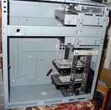 | Для винчестеров сгородил самопальное съемное шасси из алюминия. С внутренней части шасси оклеил пористой резиной от мышиного ковра. Снизу подложил куски поролона и прикрутил шасси к передней стенке корпуса через резиновые прокладки 3-мя винтами. | |