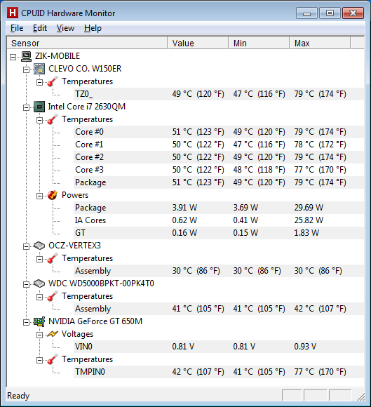 Для охлаждения использовалась родная СО с максимальной скоростью оборотов кулера (подобная "фишка" громкого но эффективного воздухооборота, позволяет отказаться от использования дополнительной охлаждающей подставки, даже несмотря на столь мощное и "горячее" железо)