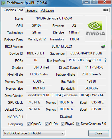 Видеокарта: GeForce GT650M GDDR5 1024Mb на частоте 745/4000МГц