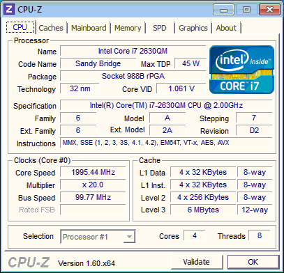 Наконец, настало время самого дорогого – процессор Core i3 2350 является достаточно быстрым «камнем», однако для серьезной работы и последних игр оптимизированных под Quad-Core CPU, его уже явно недостаточно. Надо сказать – мне просто повезло, на нашей барахолке один парень как раз продавал Core i7-2630QM за 4 тысячи рублей – он остался у него после апгрейда на Core i7 3820QM, который он заказывал на eBay для своего ThinkPad. Свой освободившейся Core i3 2350 я за 2000р запихнул знакомому в ноутбук вместо Celeron B815, уменьшив тем самым стоимость новоприобретенного Core i7-2630QM до 2 тысяч. В целом – очень неплохо :)