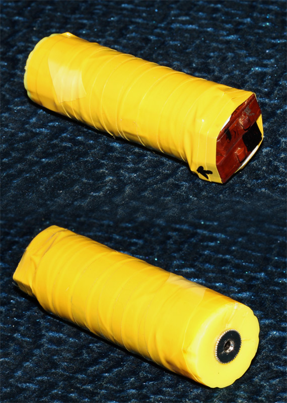 Краткие пояснения: разъем вкрутил в нижнюю часть корпуса, микрики прикрепил к верхней. Крепил их двумя винтами прямо к корпусу. Один переключатель повернут на 180 градусов относительно другого, таким образом кнопки чуть смещены друг от друга. Нажимается это дело большим пальцем, таким образом получается, что можно зажать первую кнопку (фокусировки), затем не отпуская нажать вторую (фокусировка+спуск затвора). Тактильность у кнопок хорошая, так что все достаточно удобно. Сверху все замотано желтой изолентой. Ну вот и все, собственно. Больше и не о чем тут говорить. Осталость спаять альтернативный шнурок подлинее, на случай, если придется фотографировать самого себя