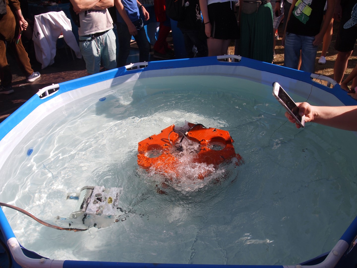 ... пара подводных дистанционно управляемых роботов плавали в бассейне неподалеку