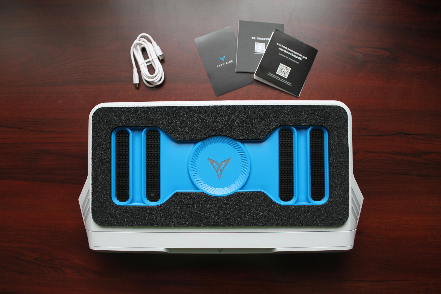 Подставка завернута в пленку и зафиксирована внутри коробки специальными вставками с двух сторон, чтобы ничего не повредилось в процессе транспортировки. Вынув из коробки всё содержимое, у нас на столе оказывается сама охлаждающая подставка, кабель для её подключения длиной около полутора метров с двумя USB Type-C на обоих концах, краткая инструкция, напечатанная на листке бумаги, похожей на кальку, где наглядно показано, как раскладывается подставка, более подробная инструкция на русском языке в виде сложенного листка, где рассказывается про возможности фирменного ПО, ещё один небольшой буклет из сложенной гармошкой плотной бумаги с образцами игровой продукции бренда (помимо прочего, Flydigi выпускают геймпады – надо будет как-нибудь затестить по случаю), а также что-то вроде гарантийного талона на китайском языке.