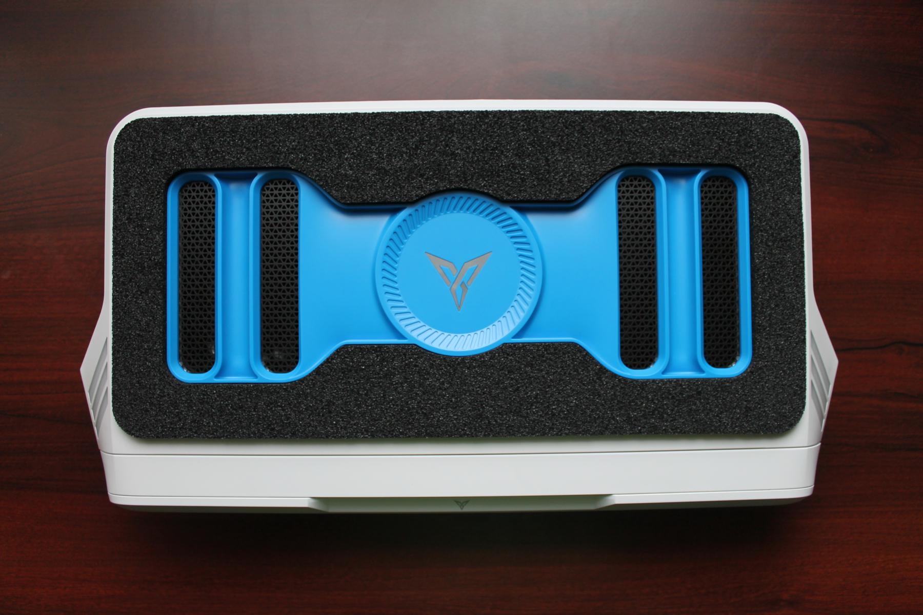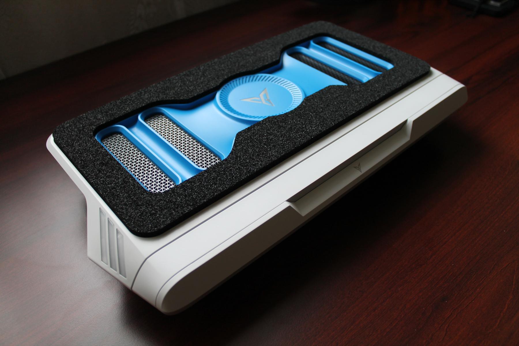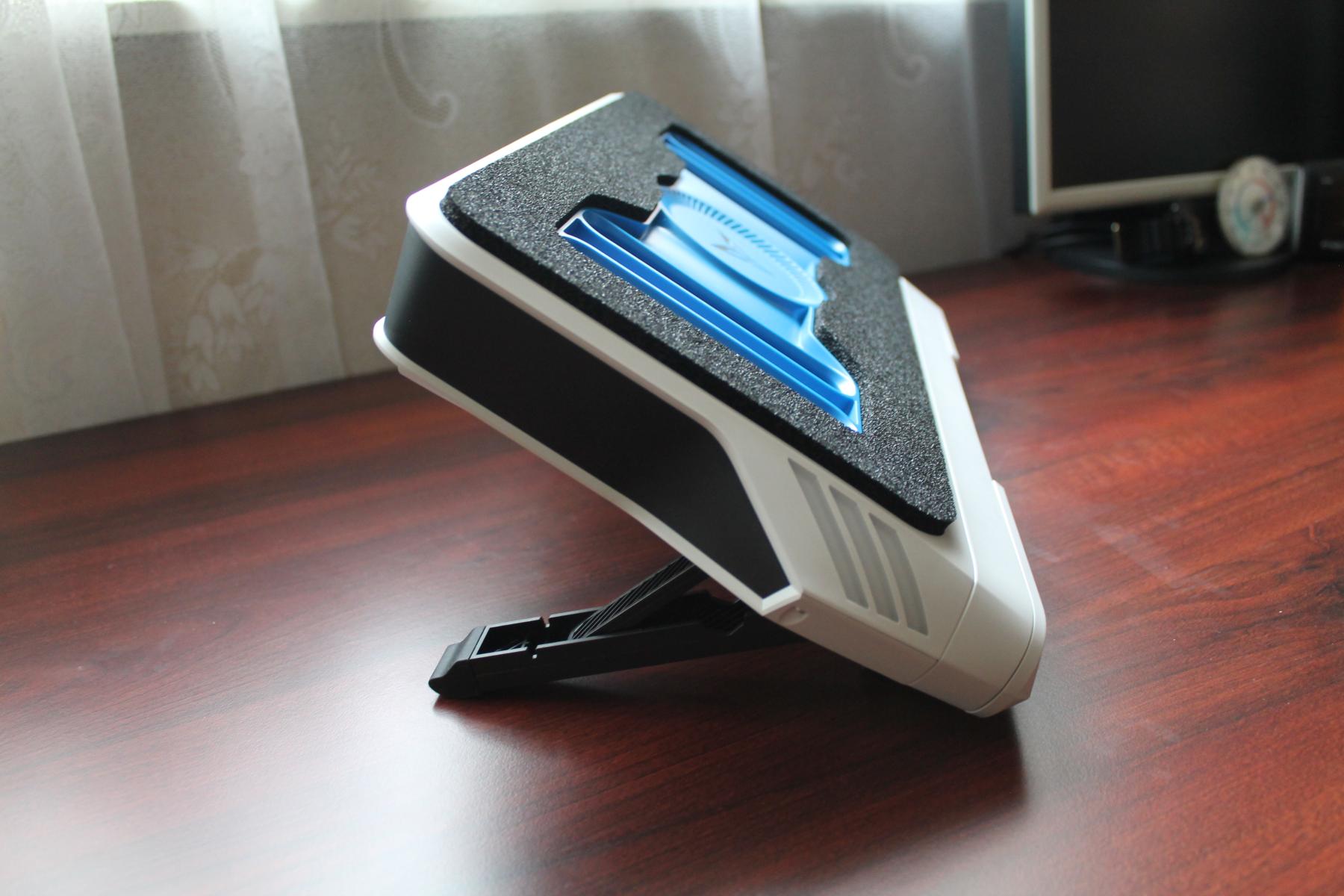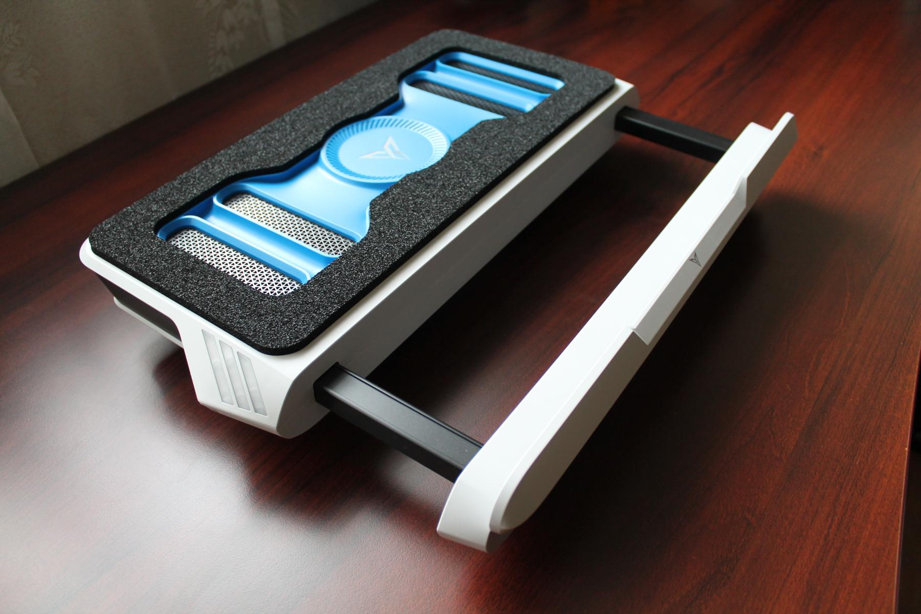 Подставка Flydigi BS1 имеет футуристичный дизайн, отдаленно чем-то напоминающий дизайн PlayStation 5. Всё такое бело-синее и ультрасовременное, с расположенными в ряд вертикальными RGB элементами на выступах по бокам, лично мне напоминающих плавники и жабры акулы. RGB элементы тут, кстати, не просто для красоты, а выполняют роль индикаторов режима работы и температуры процессора ноутбука, но об этом мы ещё поговорим подробно несколько позже. Первым делом обращает на себя внимание покрытие на верхней поверхности подставки – оно сделано из мягкой и очень приятной на ощупь вспененной резины, которую производитель называет губкой высокой плотности. Перед использование подставки следует вынуть вырезанный по центру фрагмент, который прикрывает зону охлаждения с четырьмя вытянутыми прямоугольными окошками по бокам, в то время как сам вентилятор расположен по центру, но скрыт от глаз пользователя панелью синего цвета. Таким образом, подставка имеет уплотнение по периметру зоны охлаждения на нижней поверхности ноутбука, таким образом воздух перекачивается непосредственно от подставки в ноутбук, поступая в его систему охлаждения, а не рассеиваясь по сторонам.