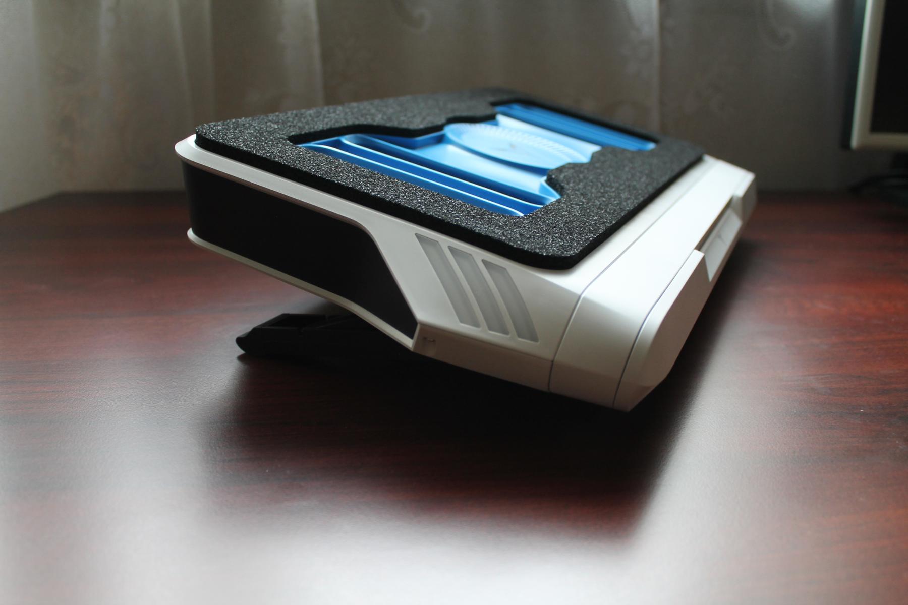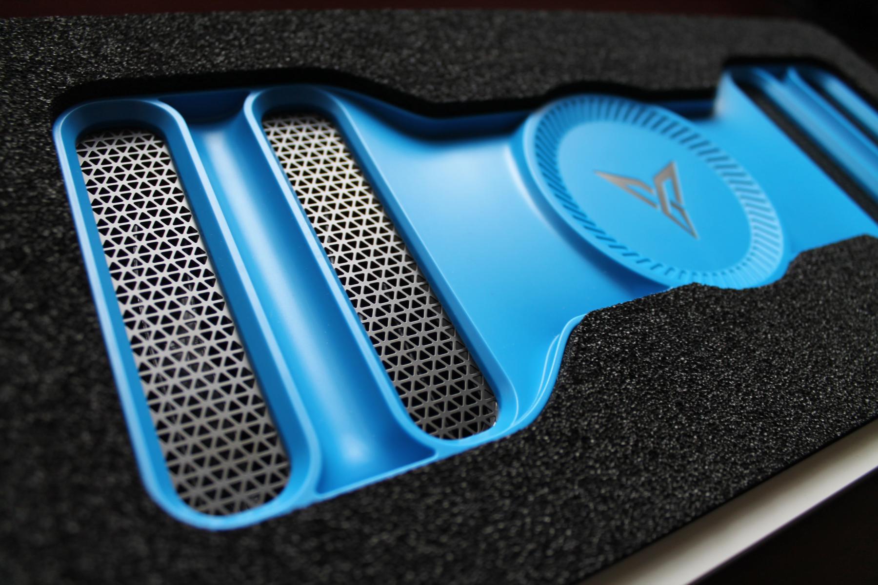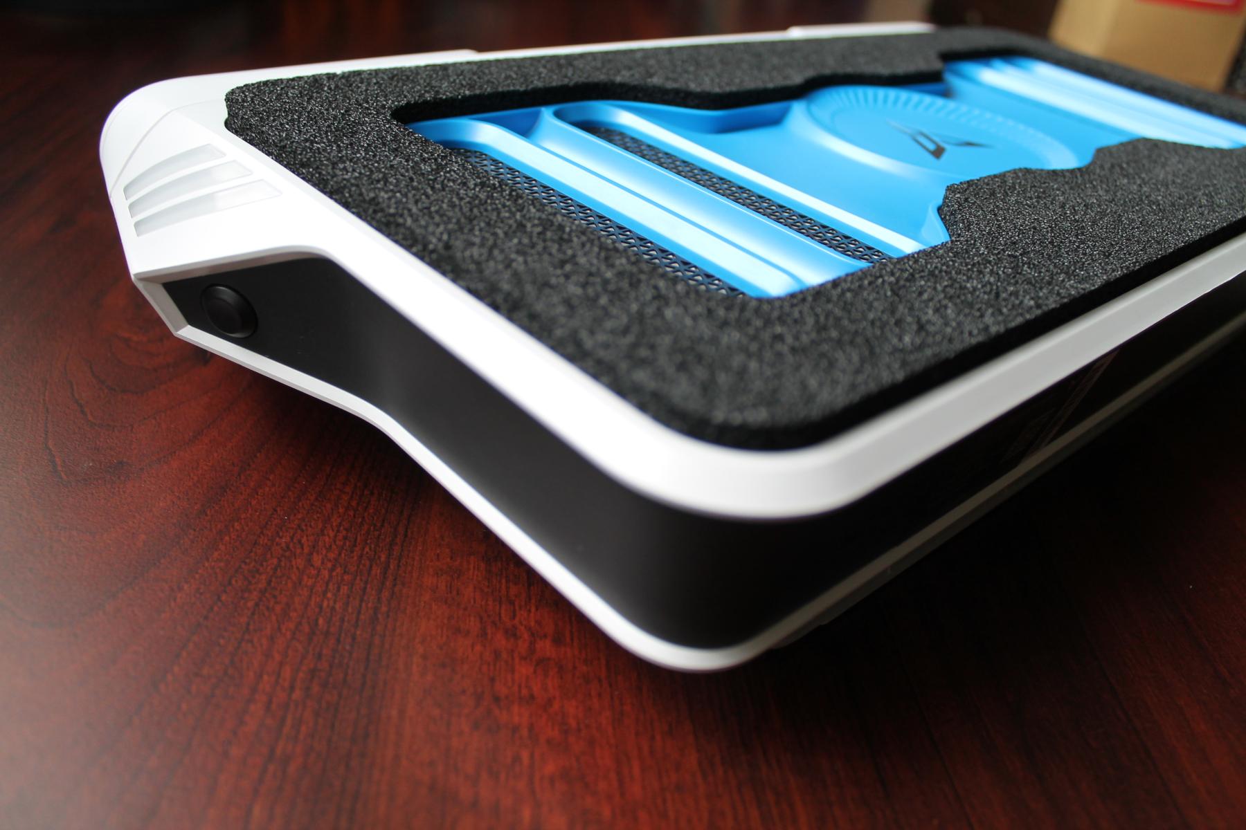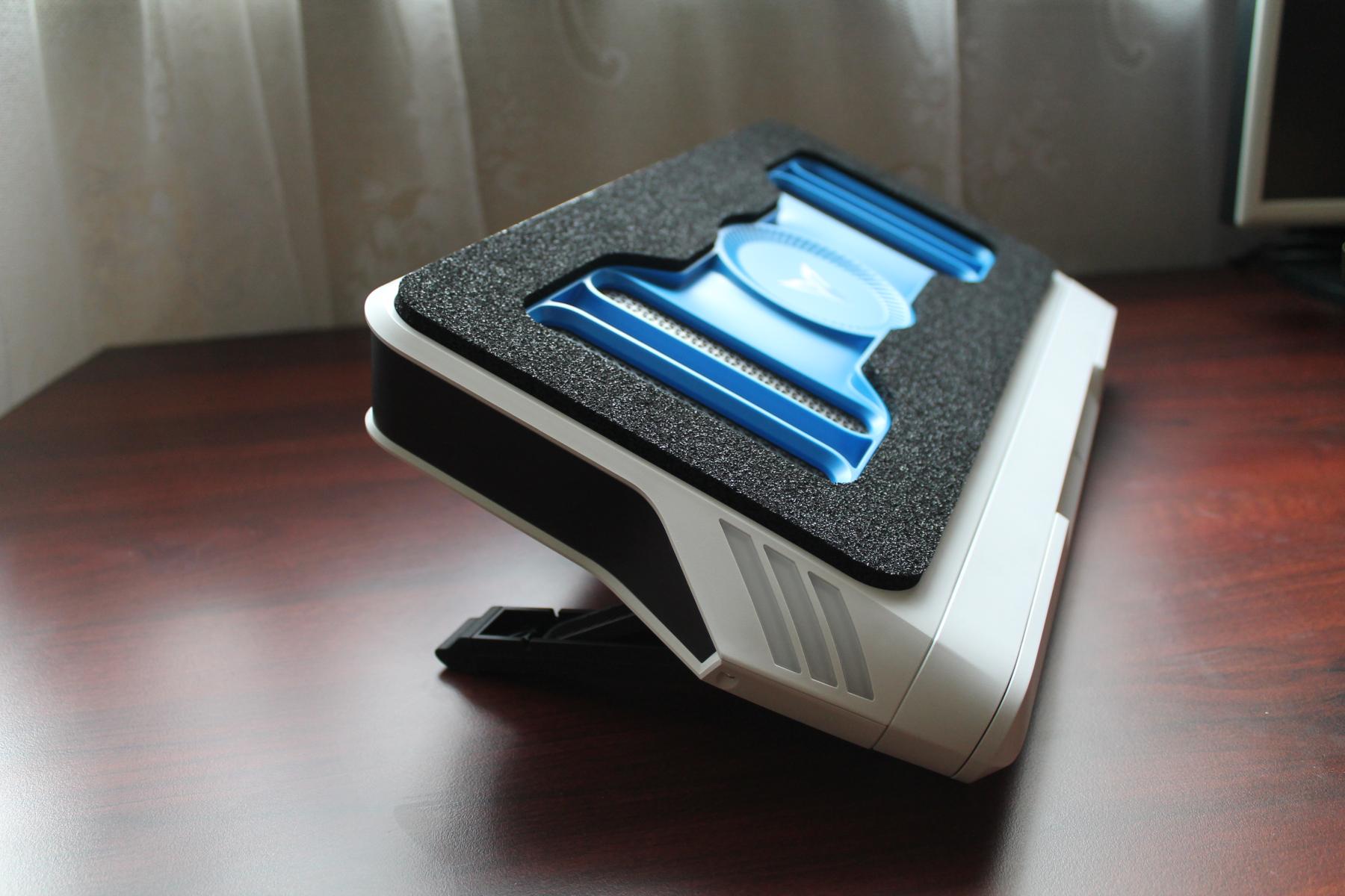 Подставка Flydigi BS1 имеет футуристичный дизайн, отдаленно чем-то напоминающий дизайн PlayStation 5. Всё такое бело-синее и ультрасовременное, с расположенными в ряд вертикальными RGB элементами на выступах по бокам, лично мне напоминающих плавники и жабры акулы. RGB элементы тут, кстати, не просто для красоты, а выполняют роль индикаторов режима работы и температуры процессора ноутбука, но об этом мы ещё поговорим подробно несколько позже. Первым делом обращает на себя внимание покрытие на верхней поверхности подставки – оно сделано из мягкой и очень приятной на ощупь вспененной резины, которую производитель называет губкой высокой плотности. Перед использование подставки следует вынуть вырезанный по центру фрагмент, который прикрывает зону охлаждения с четырьмя вытянутыми прямоугольными окошками по бокам, в то время как сам вентилятор расположен по центру, но скрыт от глаз пользователя панелью синего цвета. Таким образом, подставка имеет уплотнение по периметру зоны охлаждения на нижней поверхности ноутбука, таким образом воздух перекачивается непосредственно от подставки в ноутбук, поступая в его систему охлаждения, а не рассеиваясь по сторонам.