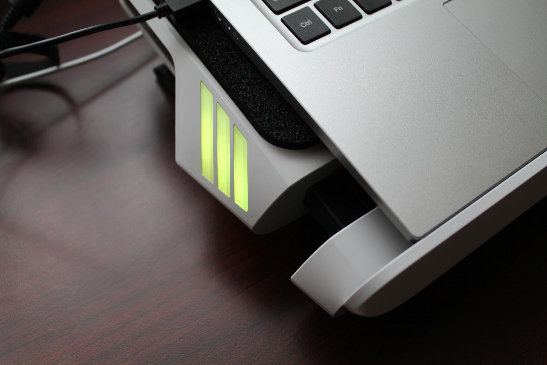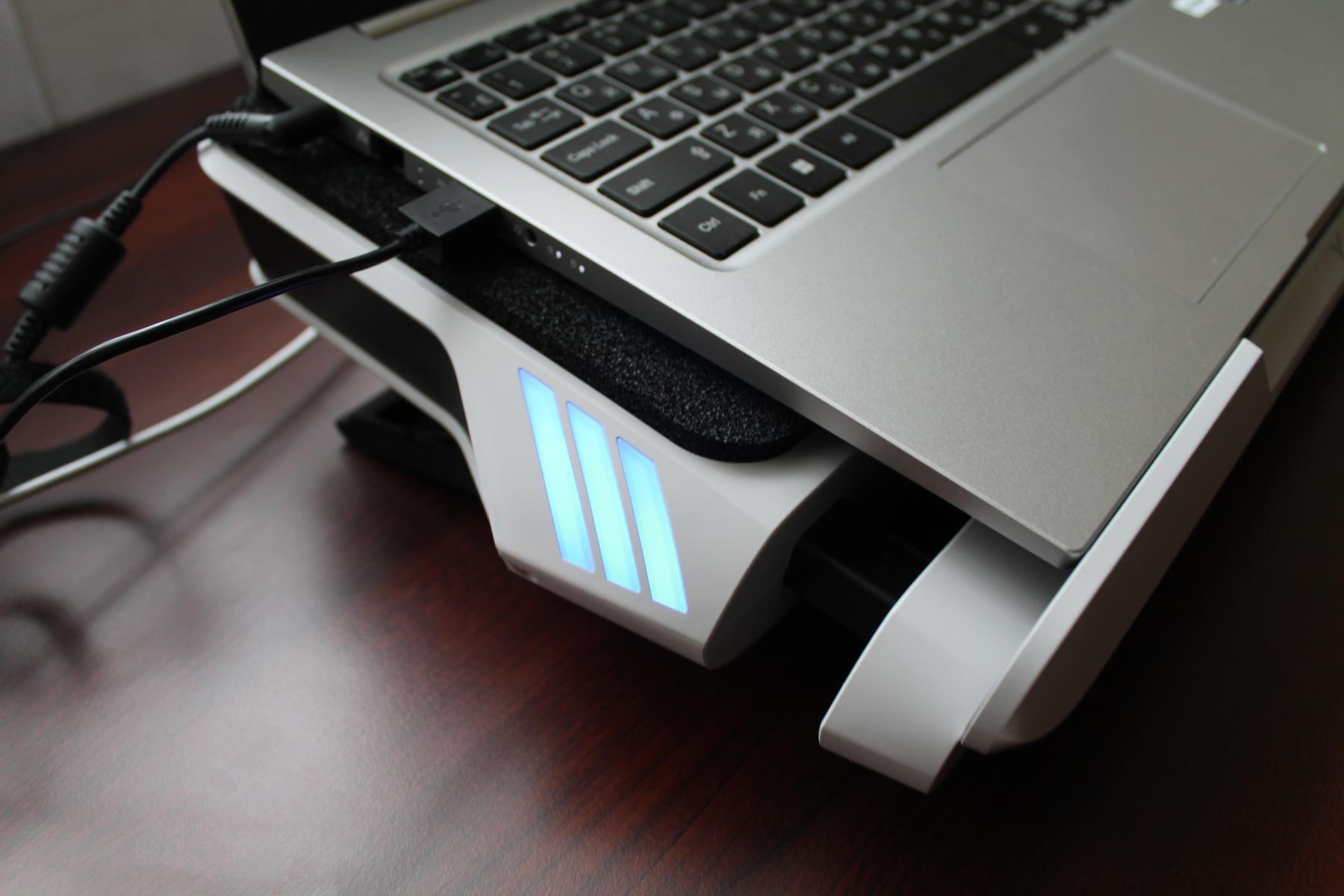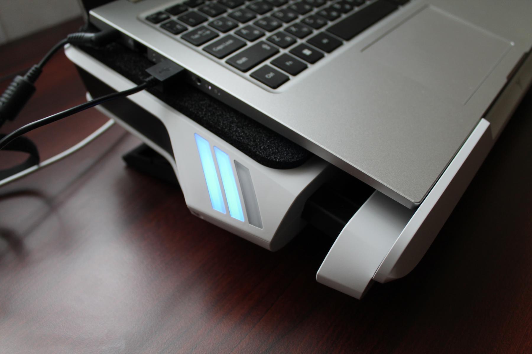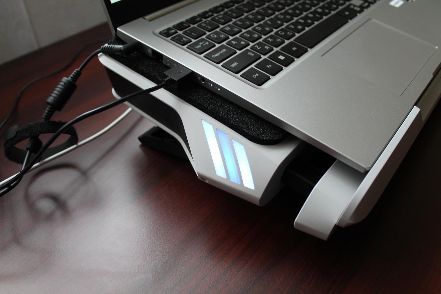 Снизу по бокам имеются подпорки с резиновыми накладками, которые позволяют устанавливать подставку под углами 10°, 20° или 30°. Благодаря этим подпоркам и широким резиновым упорам в передней части подставки, она уверенно стоит на столе под весом находящегося на ней ноутбука.