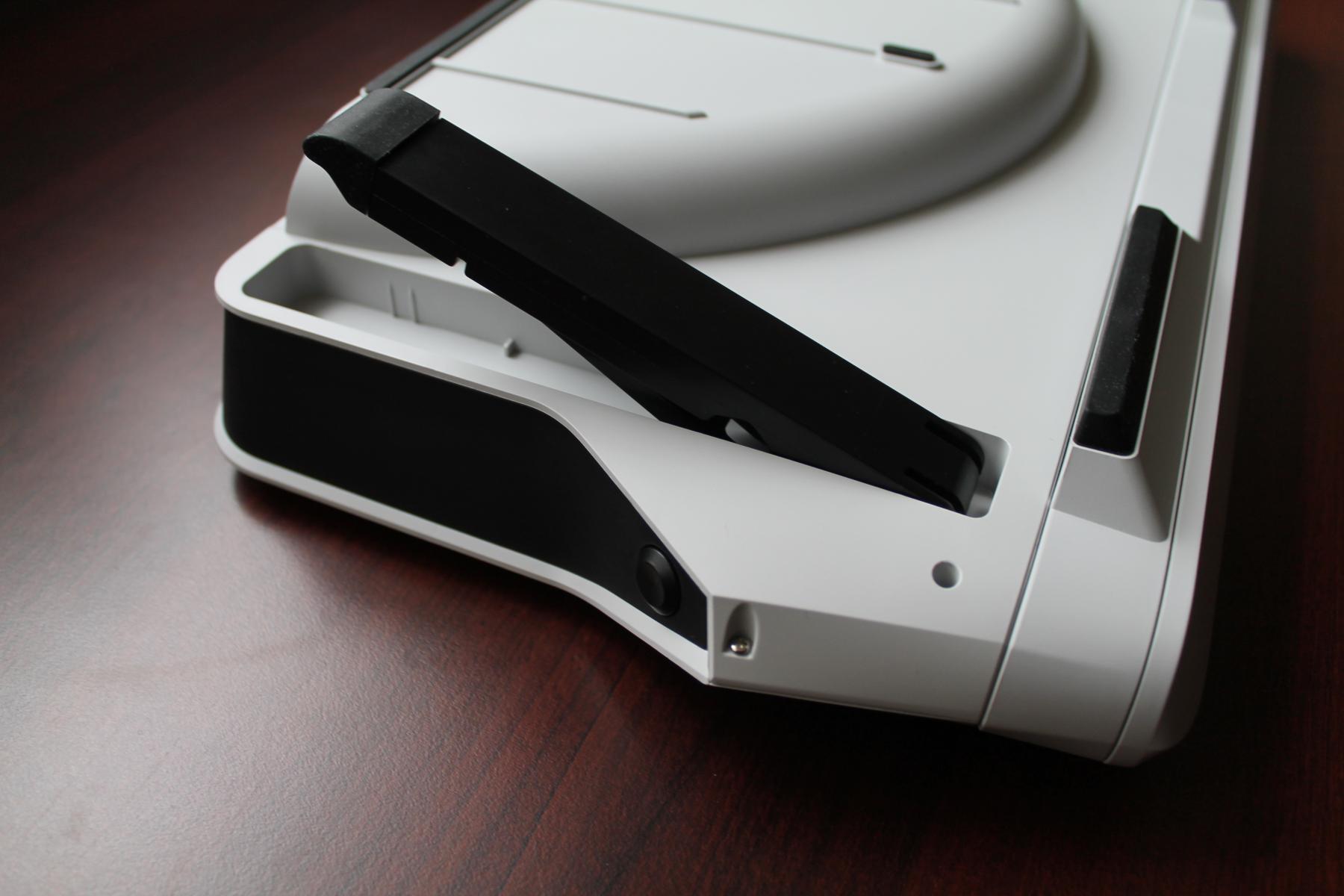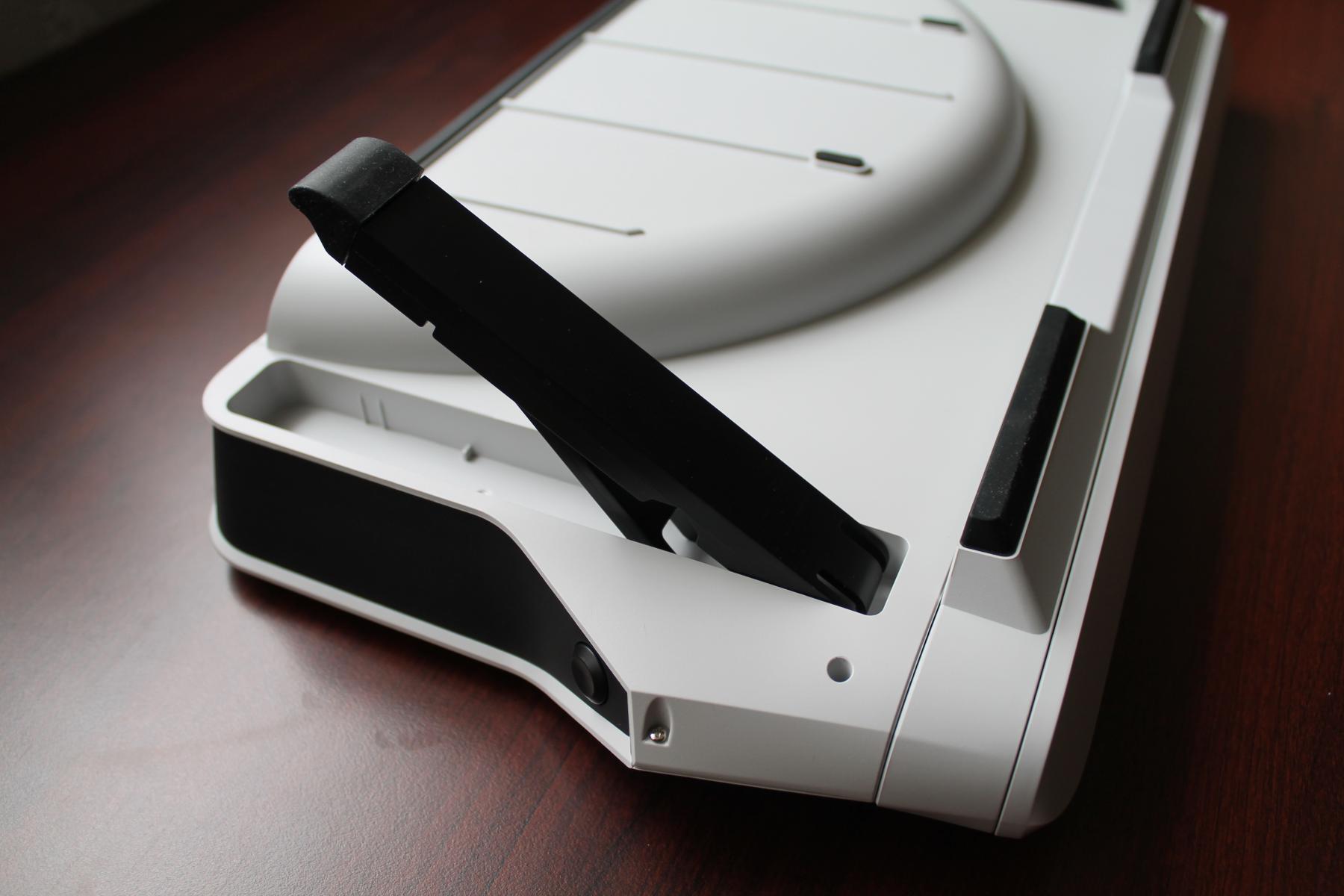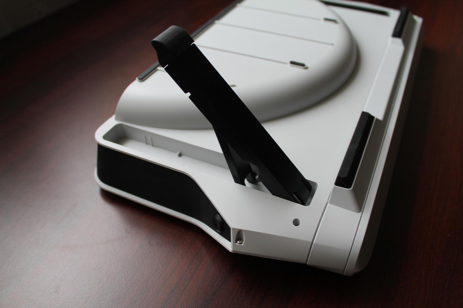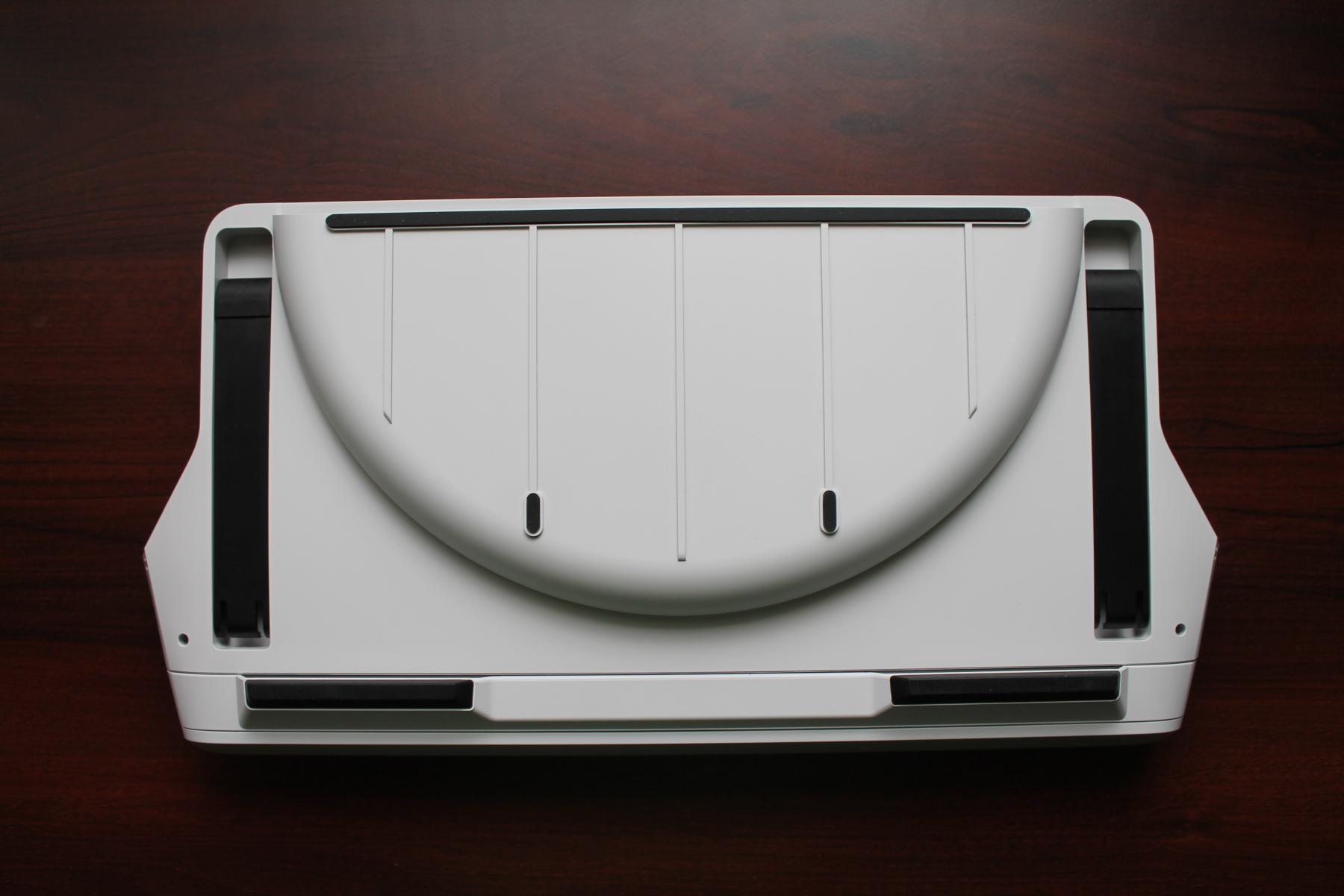 Снизу по бокам имеются подпорки с резиновыми накладками, которые позволяют устанавливать подставку под углами 10°, 20° или 30°. Благодаря этим подпоркам и широким резиновым упорам в передней части подставки, она уверенно стоит на столе под весом находящегося на ней ноутбука.