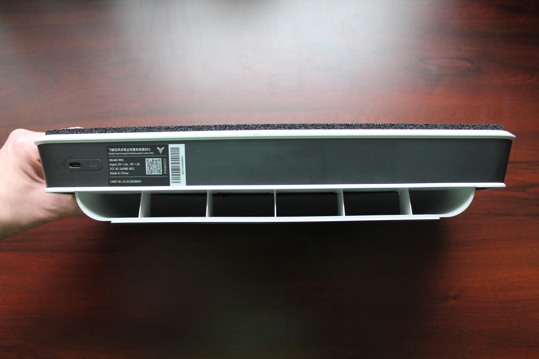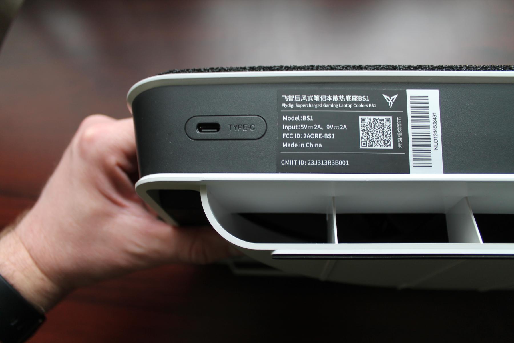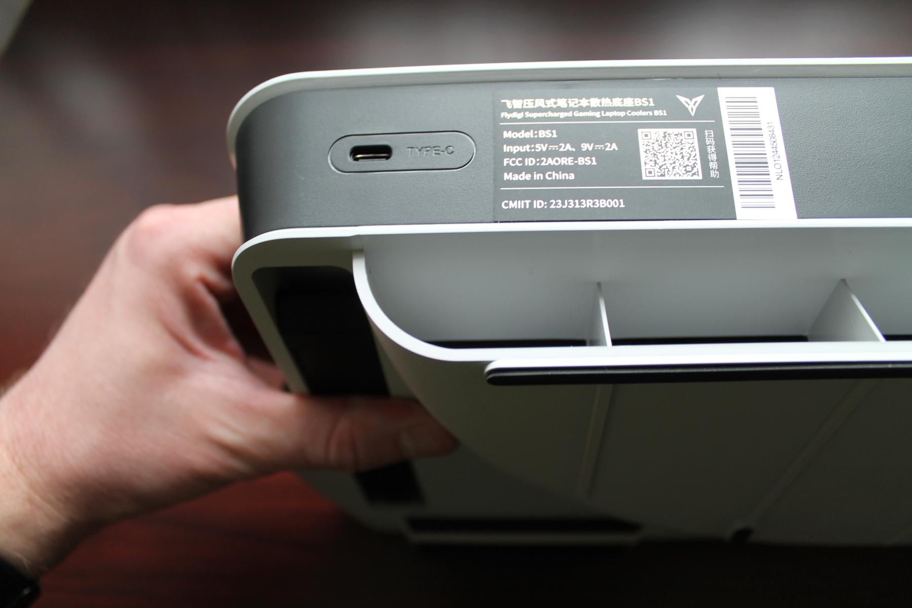 Снизу у подставки имеется большой U-образный воздухозаборник, втягивающий воздух с задней стороны, выше на корпусе подставки сзади имеется порт USB Type-C, через который она получает питание, рядом с ним указано рекомендуемое напряжение и сила тока в 5 В / 2 А или 9 В / 2 А.