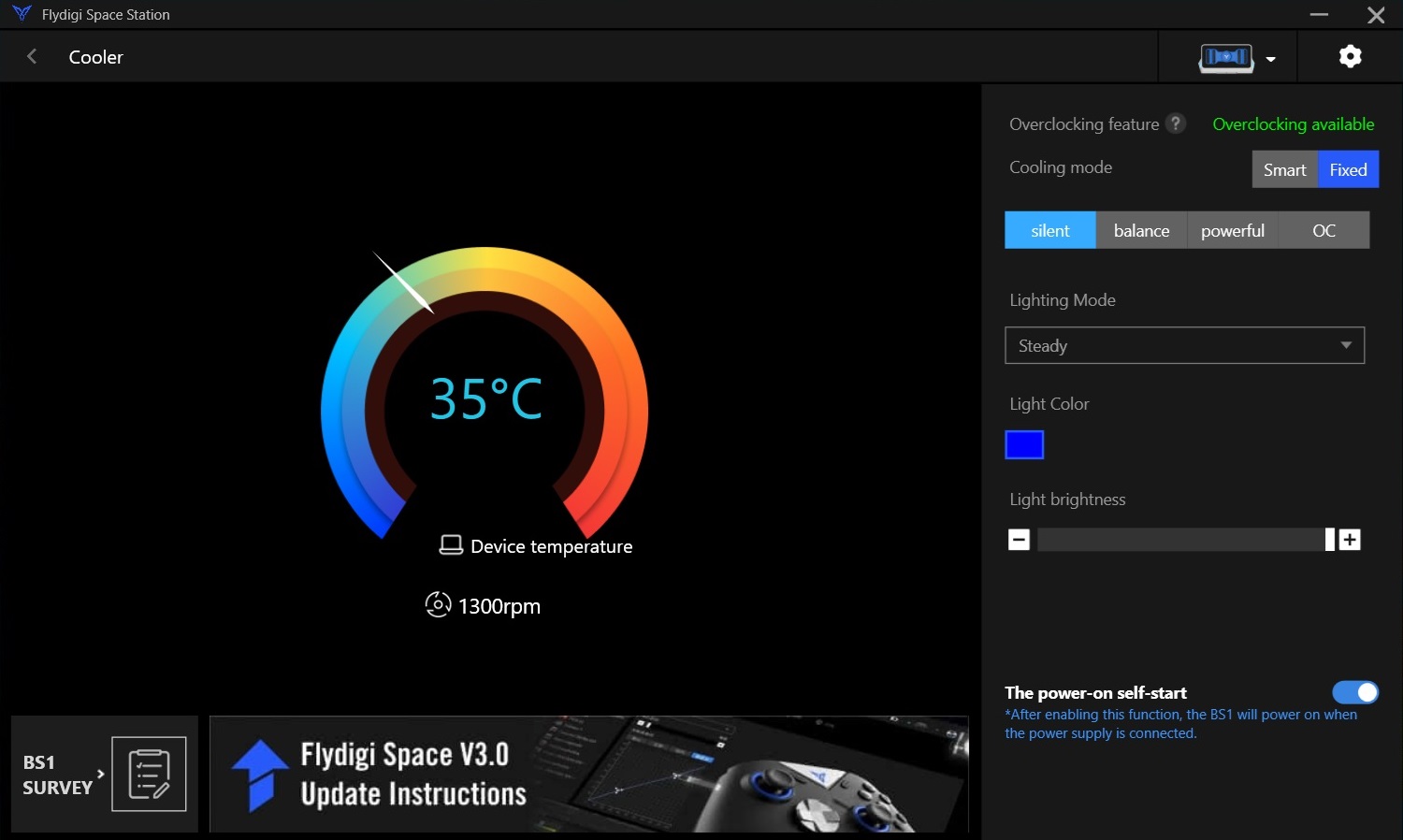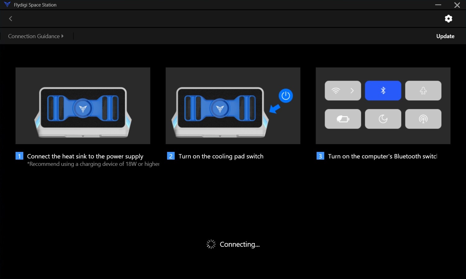 С официального сайта Flydigi.com (по адресу https://en.flydigi.com/index/down) можно скачать фирменное программное обеспечение Flydigi Space Station (актуальная на момент написания статьи версия 3.4.6.0), благодаря которому можно гибко настроить работу охлаждающей подставки. После установки программы, в верхней части окна выбираем вкладку с системами охлаждения (по умолчанию выбраны геймпады), а там – подставку Flydigi BS1, после чего появится экран с инструкцией по её сопряжению по Bluetooth с ноутбуком. В идеале, как это было у меня, на этом этапе ноутбук с включенным Bluetooth сам нашел включенную подставку и подключился к ней.
