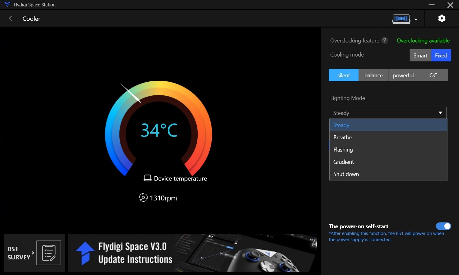 Можно переключить режим работы подставки с умного (smart) на постоянный (fixed), в котором можно самостоятельно выбирать между четырьмя режимами работы, включая тихий (silent), сбалансированный (balance), усиленный (powerful) и режим оверклокинга (OC).