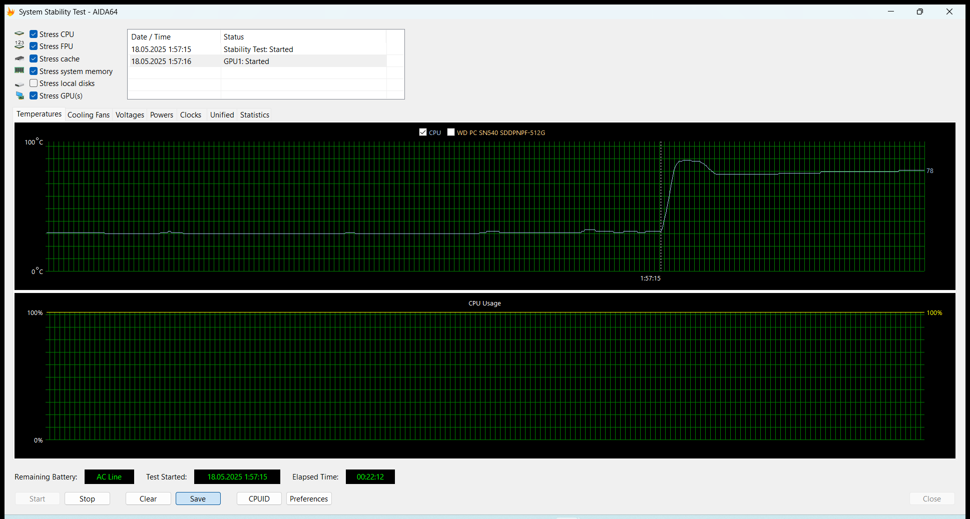 А теперь посмотрим, как охлаждающая подставка Flydigi BS1 справится с отводом тепла во время стресс-теста в AIDA64 Extreme (версия 7.60.7300) в том же умном Smart режиме с автоматическим управлением оборотами вентилятора. Для этого запустим в программе тест стабильности системы, выбрав нагрузку на CPU, FPU, GPU и память. После запуска стресс-теста температура процессора быстро достигла 70-71° C при частоте 4300 МГц, которая через несколько минут была снижена до 3000 МГц, при этом температуру удалось стабилизировать в «зелёной зоне» на отметке 60° C, вентилятор подставки при этом вращался на скорости 1700 об/мин.