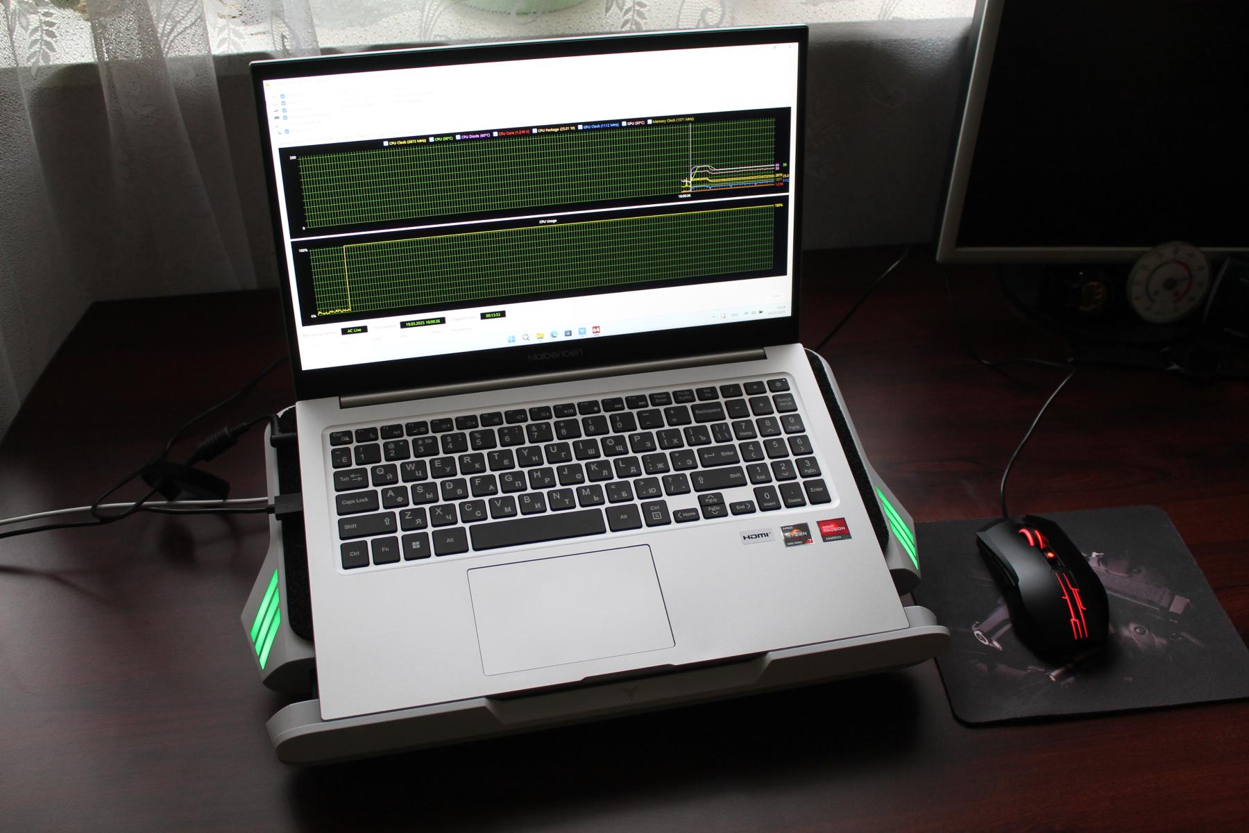 В тихом (silent) режиме при скорости вращения вентилятора подставки на уровне 1280-1320 об/мин температура процессора ноутбука растёт с 30° C до 77° C за две минуты под нагрузкой, после чего его частота снижается до 2800 МГц, а температура приходит в норму, стабилизируясь на отметке 60° C.