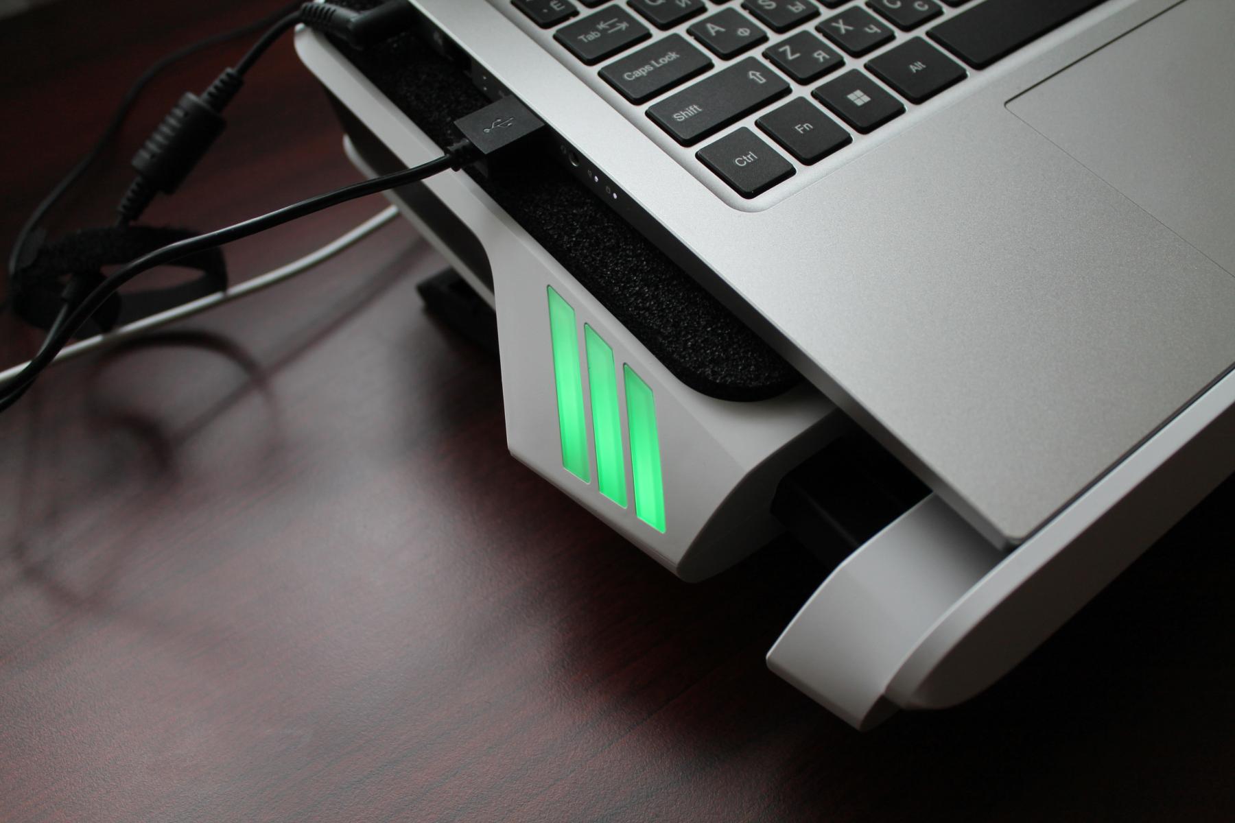 Умный режим позволяет гибко регулировать обороты вентилятора подставки в зависимости от температуры процессора, которая в идеале не должна превышать 60° C при оптимальном уровне шума, вибрации и энергопотребления подставки. Последнее особенно актуально, если подставка питается непосредственно от порта USB Type-C ноутбука. Цвет RGB элементов на подставке отражает температуру процессора ноутбука, если она не превышает 60° C, то они горят зелёным, если выше – становятся жёлтыми и так, по мере роста температуры, цвет меняется до красного.