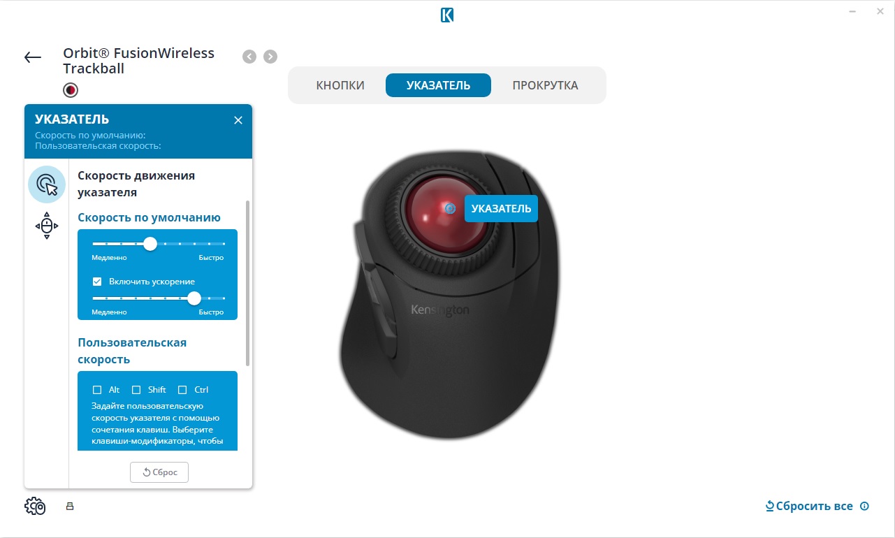 Во вкладке настройки работы указателя, можно задать скорость перемещения курсора, при том, опционально доступна функция перемещения с ускорением при вращении с определенной скоростью, но на практике я не смог однозначно оценить этот эффект. Также опционально можно задать альтернативную скорость, с которой будет перемещаться курсор при зажатой клавише Alt, Shift или Ctrl.